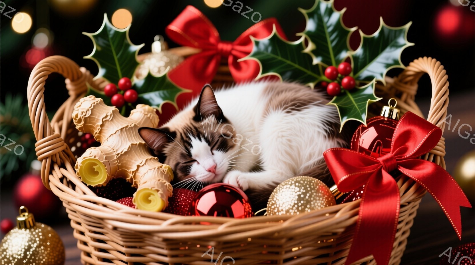 籐製のバスケットの中に、白い毛並みに茶色の縞模様の猫が丸まって眠っています。周りにはクリスマスオーナメントやリボン、葉っぱが飾られ、温かくお祝いムードが漂っています。背景はぼかされており、クリスマスツリーの光がちらちらと見え、心地よい雰囲気を醸し出しています。