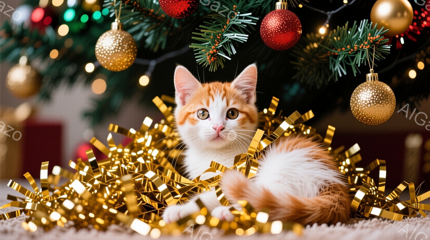 白とオレンジ色の毛並みを持つ子猫が、金色のガーランドに囲まれて横たわっています。子猫は大きな琥珀色の瞳でカメラを見つめ、リラックスした表情をしています。背景にはクリスマスツリーの飾りとプレゼントの箱が見え、暖かくお祝いムードに満ちた雰囲気です。