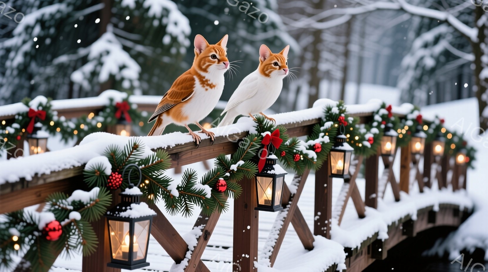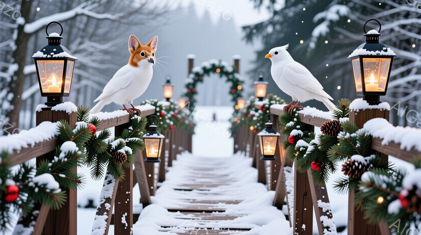 雪に覆われた木製の橋の上には、飾り付けられた松ぼっくりと葉っぱで飾られたランタンが並び、遠くには装飾されたアーチが見えます。鮮やかな赤い鳥が橋の柵にとまっており、冬の風景にアクセントを加えています。全体的に穏やかで静けさの漂う、冬の暖かい雰囲気の景色です。