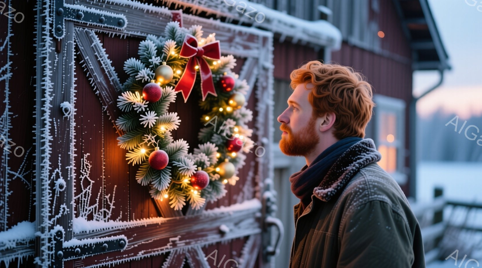 赤毛の女性が、赤い背景の壁に飾られたクリスマスリースを見上げています。彼女は黒いコートと赤いスカーフを身につけ、カールした髪が肩にかかっています。背景は雪に覆われた建物と、ややぼやけた冬の風景で、静かで落ち着いた雰囲気を醸し出しています。