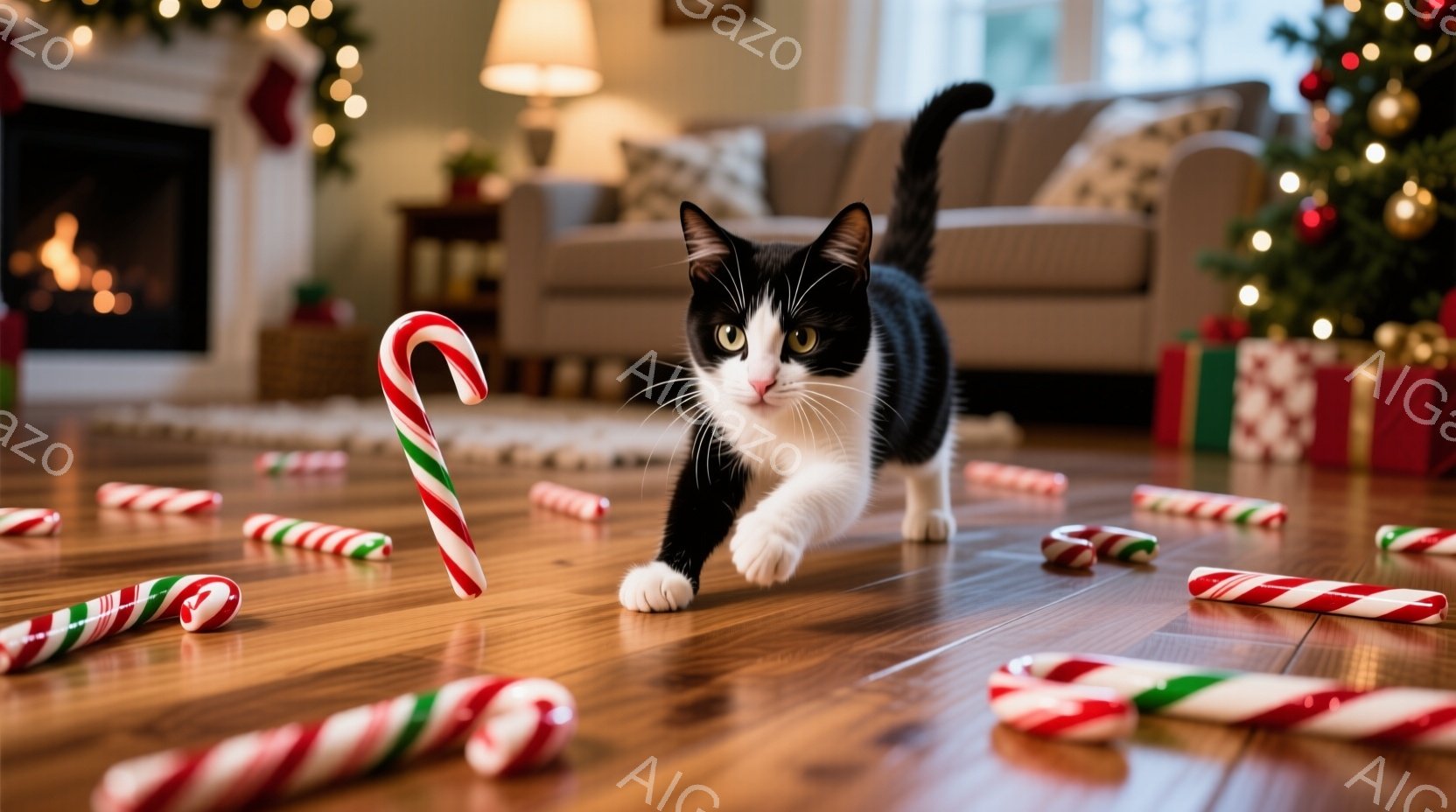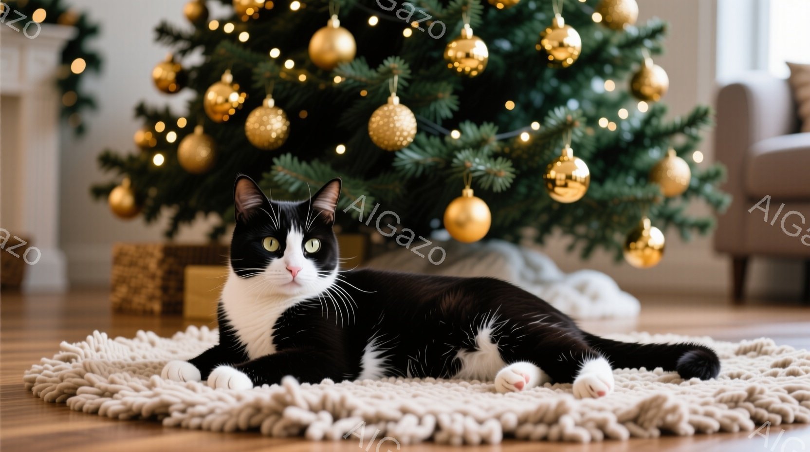 白と黒の猫が、クリーム色のポンポン付きラグの上に横たわっています。背景には、金色のオーナメントで飾られたクリスマスツリーと、プレゼントの箱が見え、暖かく穏やかな雰囲気が漂っています。猫はリラックスした表情で、カメラの方を見ています。