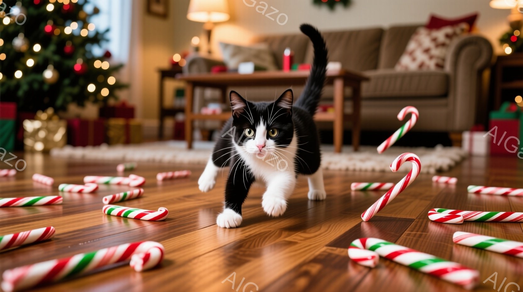 白と黒の模様の小さな子猫が、床に散らばったキャンディケーンの間を駆け抜けています。背景にはクリスマスツリーと暖炉があり、部屋全体が温かく、お祝いの雰囲気に包まれています。木製の床とクリスマス装飾が、ほっとするホリデーシーズンらしさを強調しています。