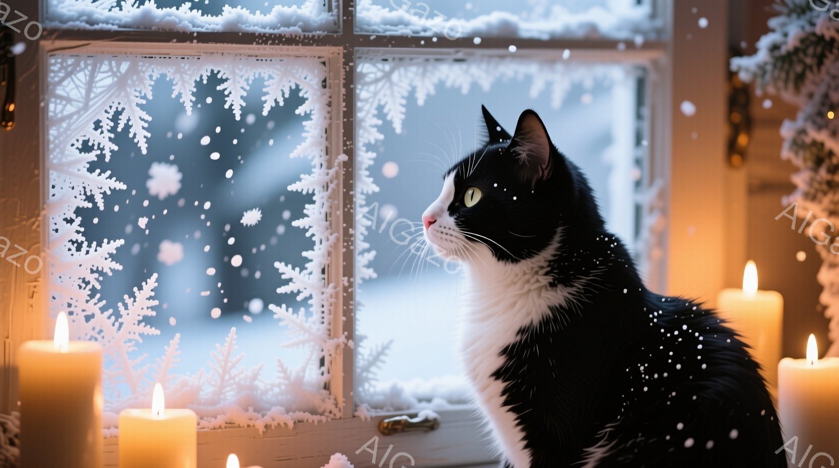白と黒の猫が窓の外の雪景色を眺めています。窓には雪の結晶が描かれ、周囲には温かい光を放つキャンドルがいくつか置かれています。背景にはぼやけた木々と雪が舞う冬の景色が広がり、全体的に穏やかで幻想的な雰囲気を醸し出しています。