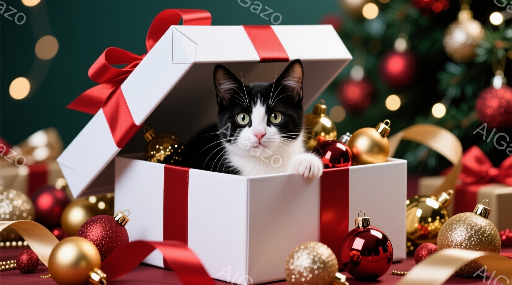 白と黒の猫が、赤いリボンで飾られた白いギフトボックスの中に座っています。猫は箱から少し顔を出しており、好奇心と遊び心にあふれた表情をしています。背景には、赤や金色のクリスマスオーナメントが散りばめられており、華やかで祝祭的な雰囲気を醸し出しています。