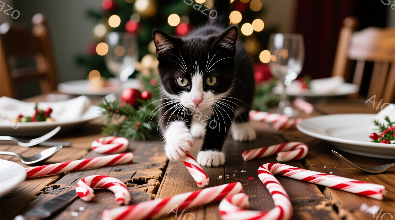 白と黒の猫が、クリスマスらしいテーブルの上を歩いています。テーブルにはキャンディケーンやクリスマスの飾り付けの入った皿が散らばっており、背景にはぼやけたクリスマスツリーと暖炉が見えます。全体的に、温かく、お祝いムードにあふれた雰囲気です。