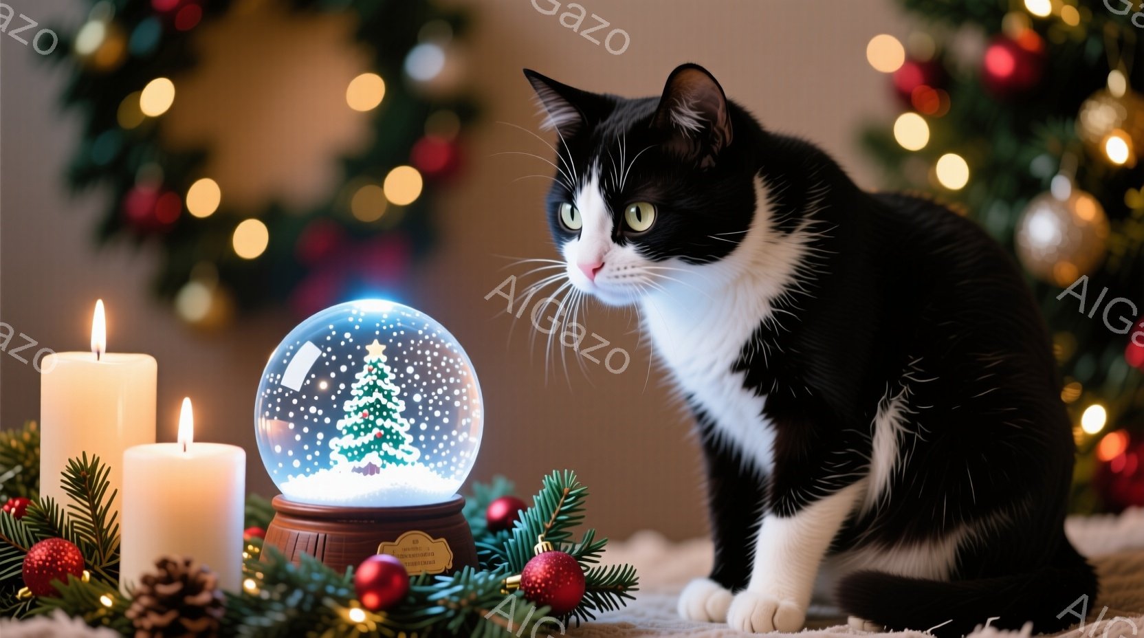 この無料AI生成画像「白と黒の猫が、クリスマスの模様が施されたクッションに囲まれたベージュ色のソファに横たわっています。猫はリラックスした表情で、前足を揃えてこちらを見ています。背景には暖炉の火が灯り、クリスマスツリーの明かりがぼんやりと見える、温かく居心地の良い雰囲気です。」は、2025年10月25日に作成されました。 サイズは 1664×928px の高解像度で、商用利用も可能なフリー素材として提供しています。