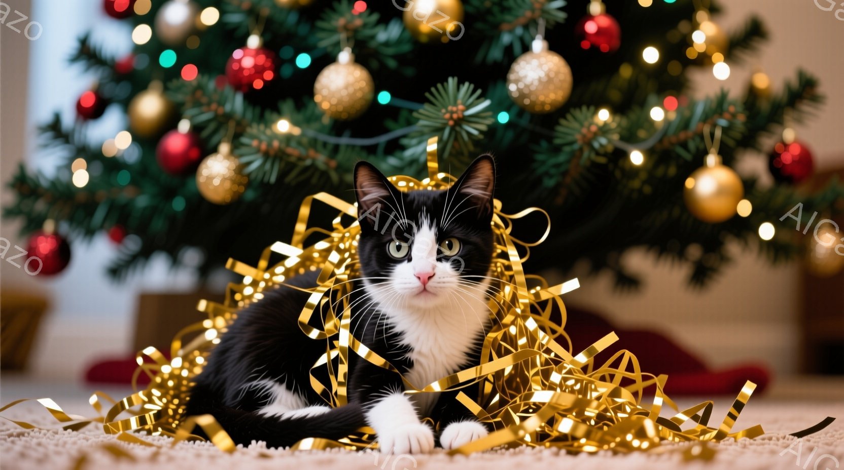白と黒の猫が、金色のリボンに囲まれてカーペットの上に横たわっています。背景には、クリスマスツリーが飾られ、プレゼントボックスが置かれています。暖かく、お祝いの雰囲気で、猫はリラックスして穏やかな表情をしています。