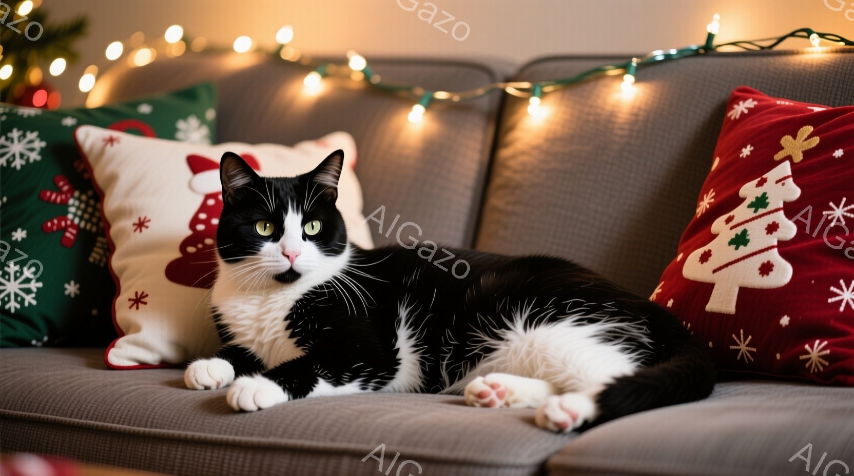 この無料AI生成画像「白と黒の毛並みを持つ子猫が、クリスマスを象徴するキャンディケーンやジンジャーブレッドクッキーに囲まれたバスケットの中にいます。子猫は正面を見つめ、興味深そうな表情をしています。背景にはぼやけたクリスマスツリーの光が見え、暖かくお祝いムードを演出しています。」は、2025年10月25日に作成されました。 サイズは 1664×928px の高解像度で、商用利用も可能なフリー素材として提供しています。