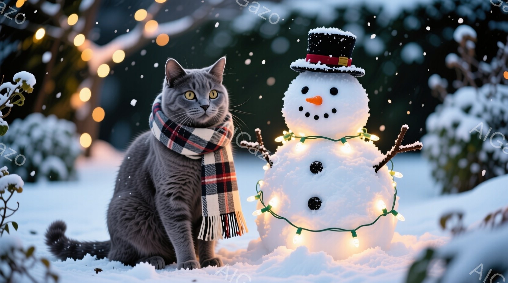 灰色の猫が雪の上に座り、赤と黒のチェック柄のマフラーを巻いています。表情は穏やかで、少しこちらを見ているようです。背景には雪に覆われた植物と、電飾で飾られた雪だるまがあり、冬の暖かく幻想的な雰囲気を醸し出しています。