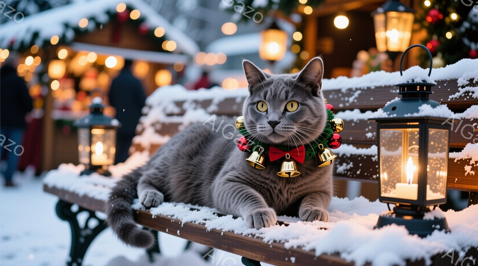 灰色の毛並みの猫が雪の積もったベンチに横たわっており、首輪には赤い実と鈴がついたクリスマス風の飾りがあります。背景にはぼんやりとクリスマスの装飾が施された建物が見え、雪が舞い散る冬の夜の様子が伺えます。全体的に暖かく、穏やかで、お祝いムードに満ちた雰囲気です。