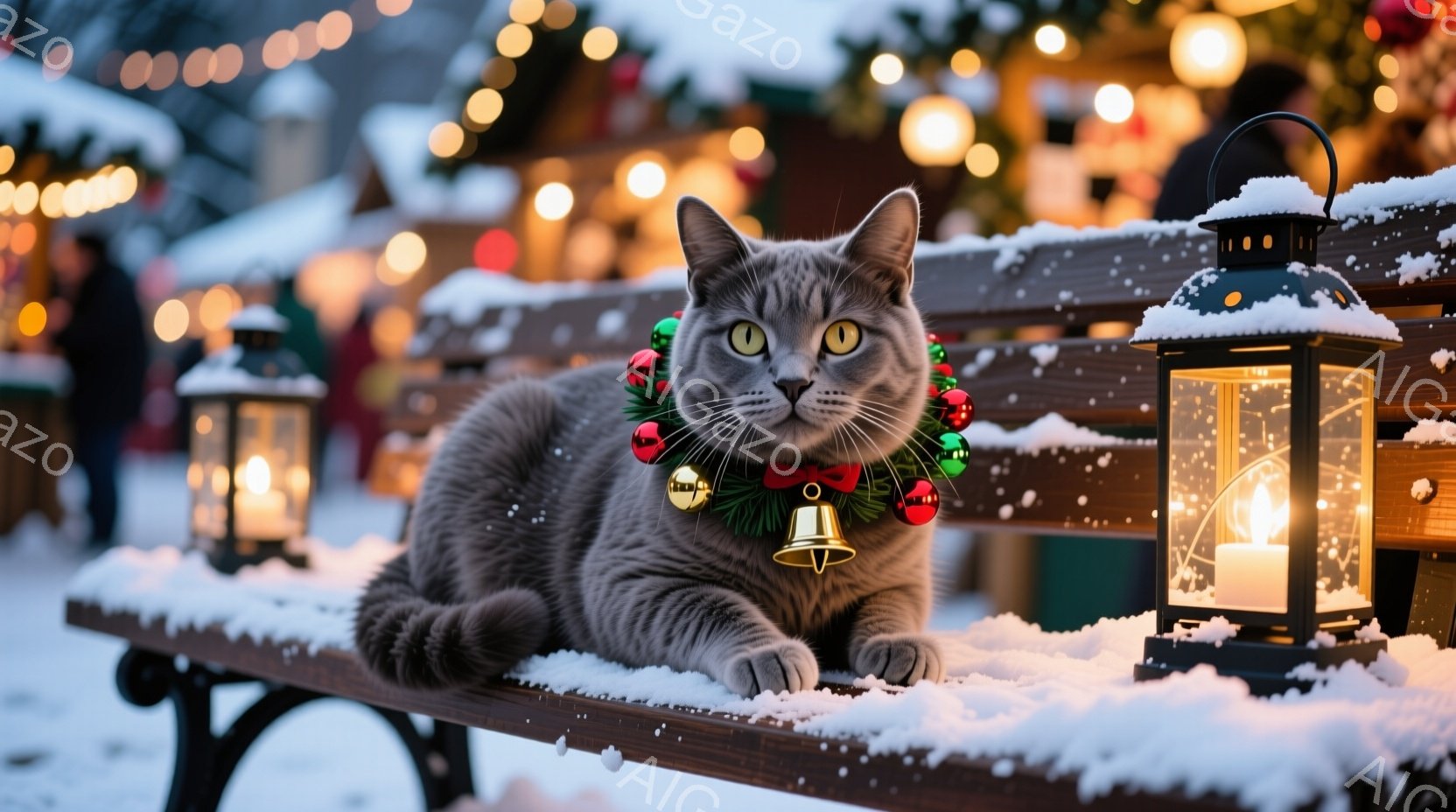 灰色の猫が雪で覆われたベンチに横たわっています。首にはクリスマス風の首輪がついており、その表情は穏やかでリラックスしています。背景には、ぼんやりとしたクリスマスマーケットの光が灯り、雪が舞う冬の夜の温かく幻想的な雰囲気を醸し出しています。