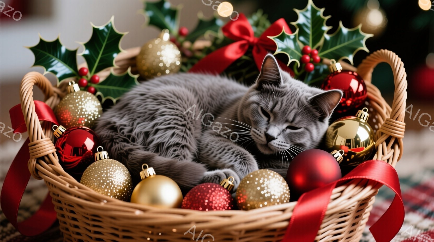 灰色の猫が、クリスマスオーナメントで飾られたバスケットの中で丸まって眠っています。背景には緑の葉と赤い実の飾り、そしてぼやけたクリスマスツリーの光が散りばめられ、温かく穏やかな雰囲気を醸し出しています。猫はリラックスした表情で、ホリデーシーズンの安らぎを感じさせます。