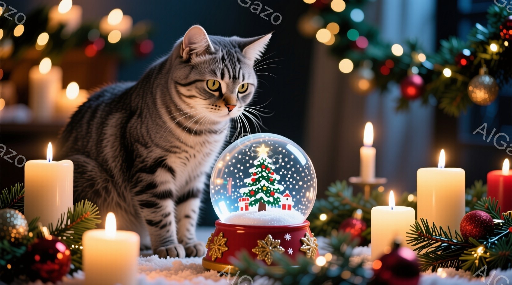 灰色の縞模様の猫が、雪の結晶が舞うクリスマスのツリーが入ったスノーグローブの前に座っています。周囲には、温かい光を放つ複数のロウソクが配置され、背景には緑のクリスマスツリーとぼやけたキラキラした光が広がっています。 全体的に、暖かく、穏やかで、クリスマスの魔法のような雰囲気が漂っています。