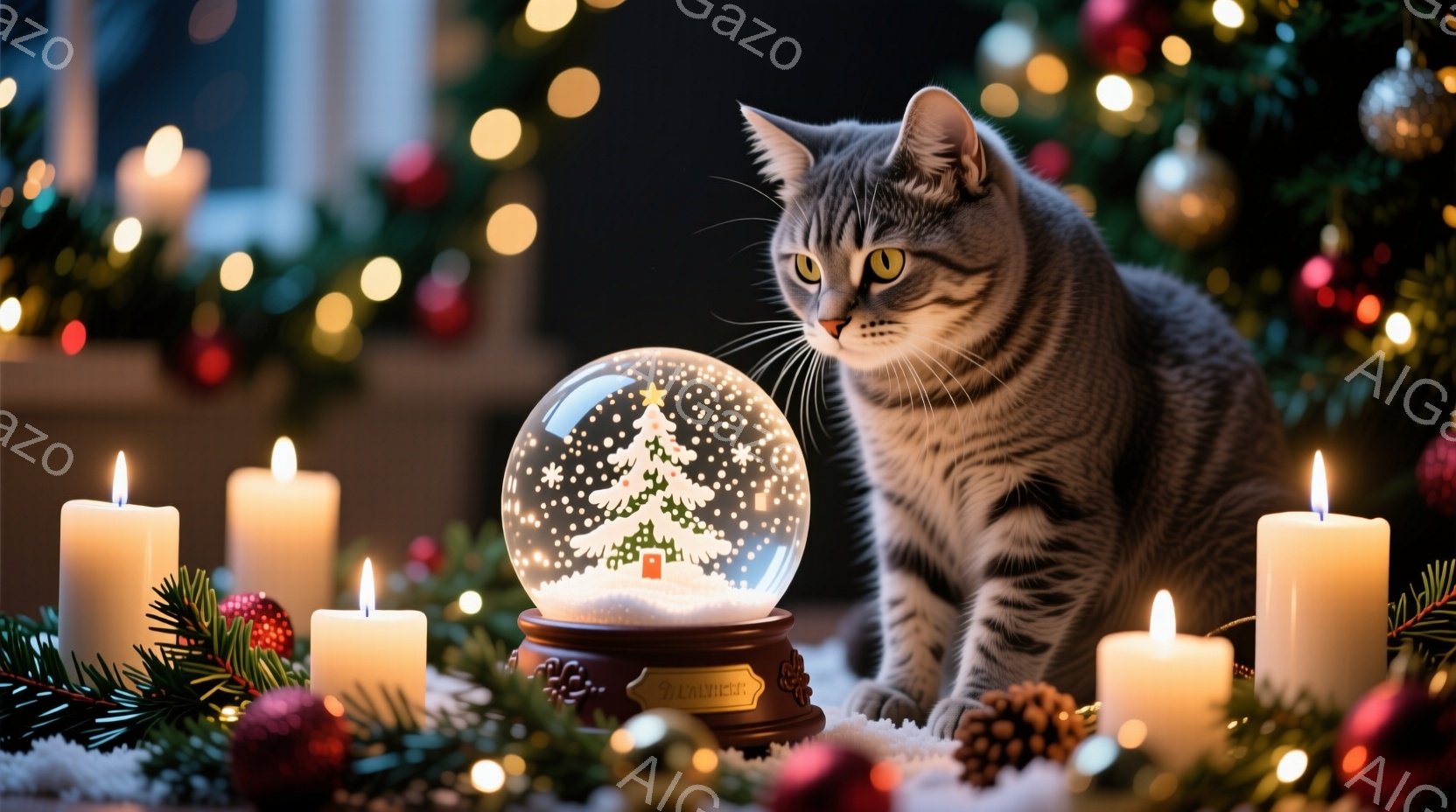 灰色の猫が、雪の降るクリスマスのオーナメントのガラス玉の前に立っています。周囲には点灯したキャンドルとクリスマスツリーの飾り付けがあり、暖かく幻想的な雰囲気を作り出しています。背景にはぼんやりと暖炉が見え、冬の温かい祝祭の光景が広がっています。