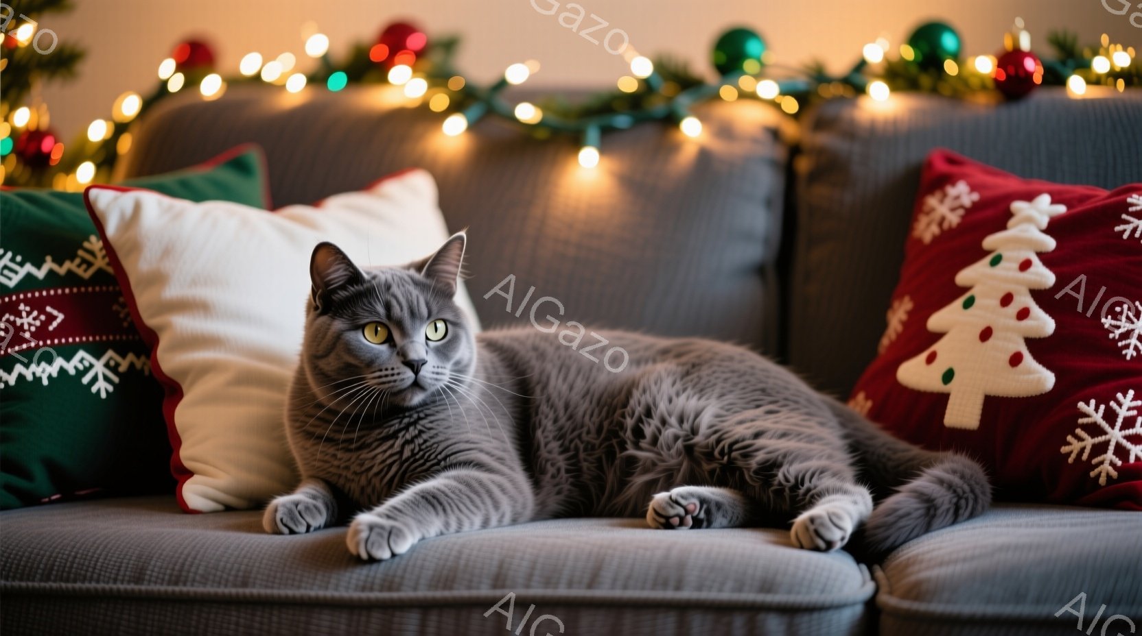 灰色の猫が、クリスマスの柄のクッションに囲まれた灰色のソファに横たわっています。猫はリラックスした表情で、前足は組み、視線は正面を向いています。背景には、キラキラ光るクリスマスライトがあり、暖かい冬の雰囲気を演出しています。