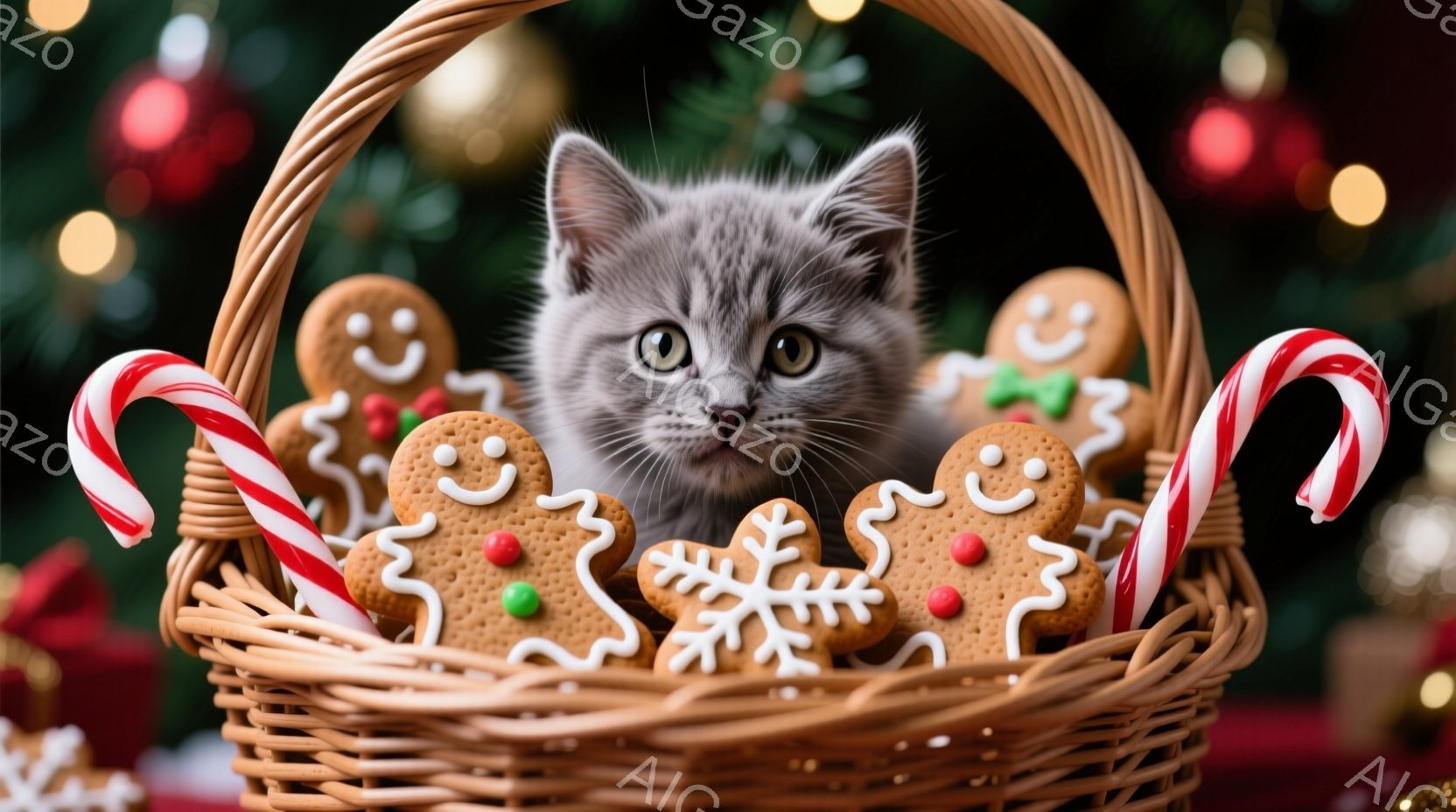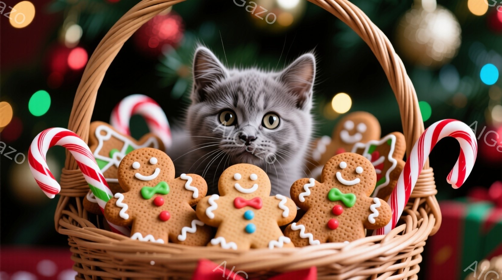 籐のバスケットの中に、グレーの縞模様の小さな子猫が座っています。周りには、ジンジャーブレッドクッキーやキャンディケーンが散りばめられ、クリスマスの雰囲気を演出しています。背景にはぼやけたクリスマスツリーの飾りが見え、暖かくお祝いムードに包まれています。