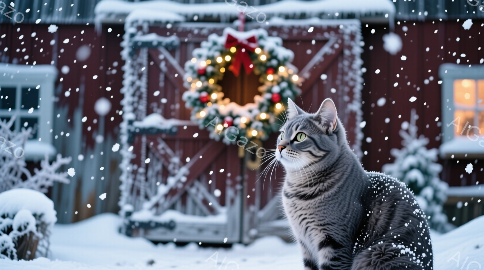 浅い籐のバスケットの中に、灰色の毛並みを持つ子猫が可愛らしく顔を覗かせています。周りにはジンジャーブレッドマンやキャンディケーンが散りばめられ、クリスマスらしい温かい雰囲気を醸し出しています。背景にはぼやけたクリスマスツリーの光が輝き、お祝いのムードを高めています。