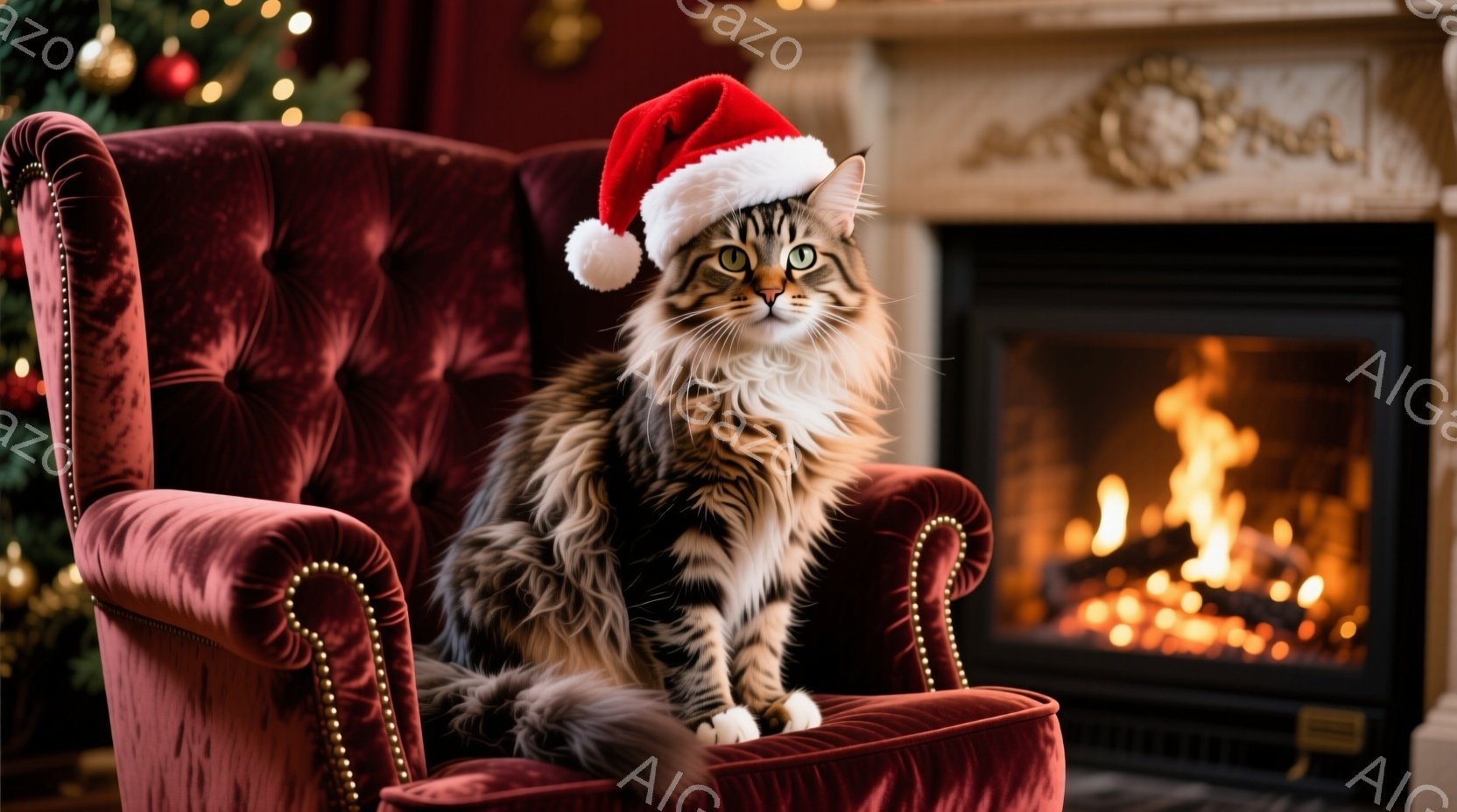 長い毛並みの茶トラ猫が、赤いベルベット調の肘掛け椅子に座っています。頭にはサンタ帽がちょこんと乗っており、緑色の瞳がこちらを見て、少しばかり退屈そうな表情を浮かべています。背景には暖炉の炎とクリスマスの飾り付けが見え、暖かい祝祭の雰囲気が漂っています。