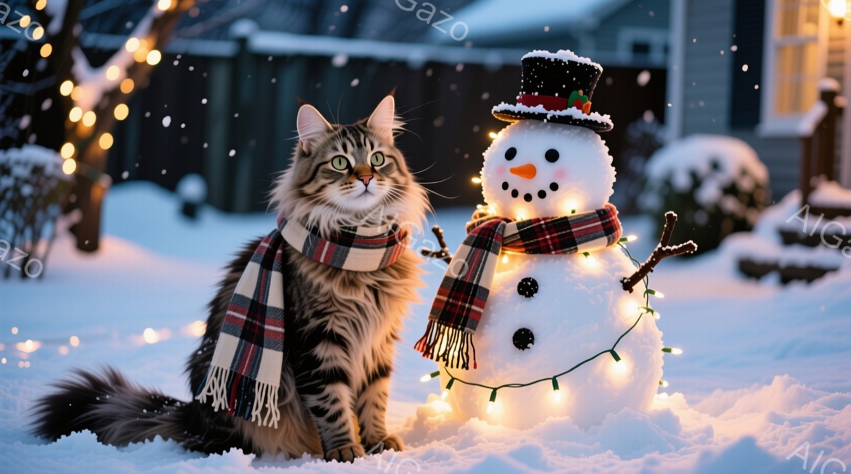 長毛の縞模様の猫が雪の中に座り、赤いチェック柄のスカーフを巻いている。その隣には、ニンジンで鼻が作られ、ライトで飾られた雪だるまが立っている。背景には雪景色が広がり、暖かい光が灯った家が見え、冬の穏やかな雰囲気が漂っている。