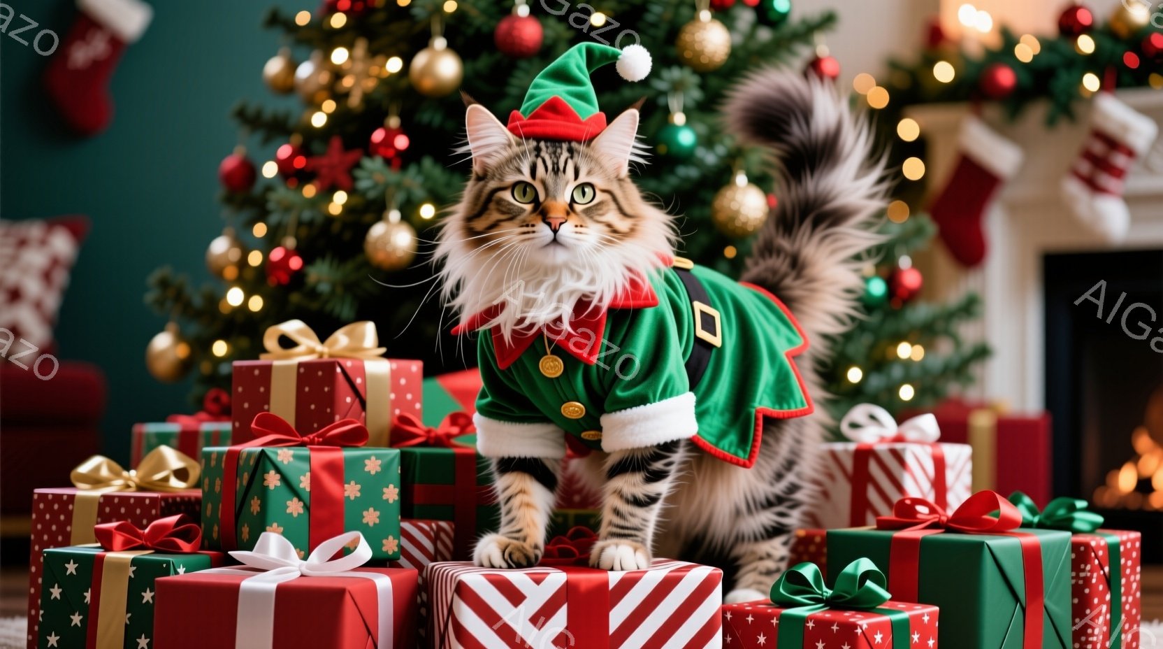 茶色の縞模様の猫が、クリスマスのエルフの衣装を着て、プレゼントの山の上に座っています。猫は緑色のベストと赤い帽子を身に着け、自信に満ちた表情で正面を見つめています。背景には、飾られたクリスマスツリーと暖炉があり、ホリデーシーズンの温かくお祝いの雰囲気を醸し出しています。