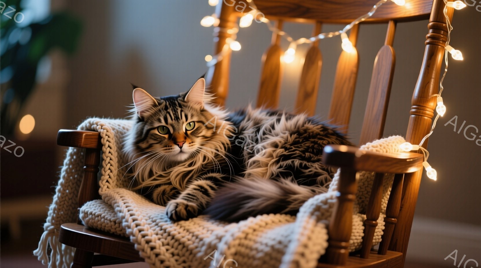 長毛の縞模様の猫が、編み物のブランケットが敷かれたロッキングチェアにゆったりと横たわっています。猫は少し目を細め、リラックスした表情を浮かべており、背景にはぼんやりと植物が見え、温かい光のストリングライトが飾られています。 全体的に、穏やかで居心地の良い、安らかな雰囲気が漂っています。