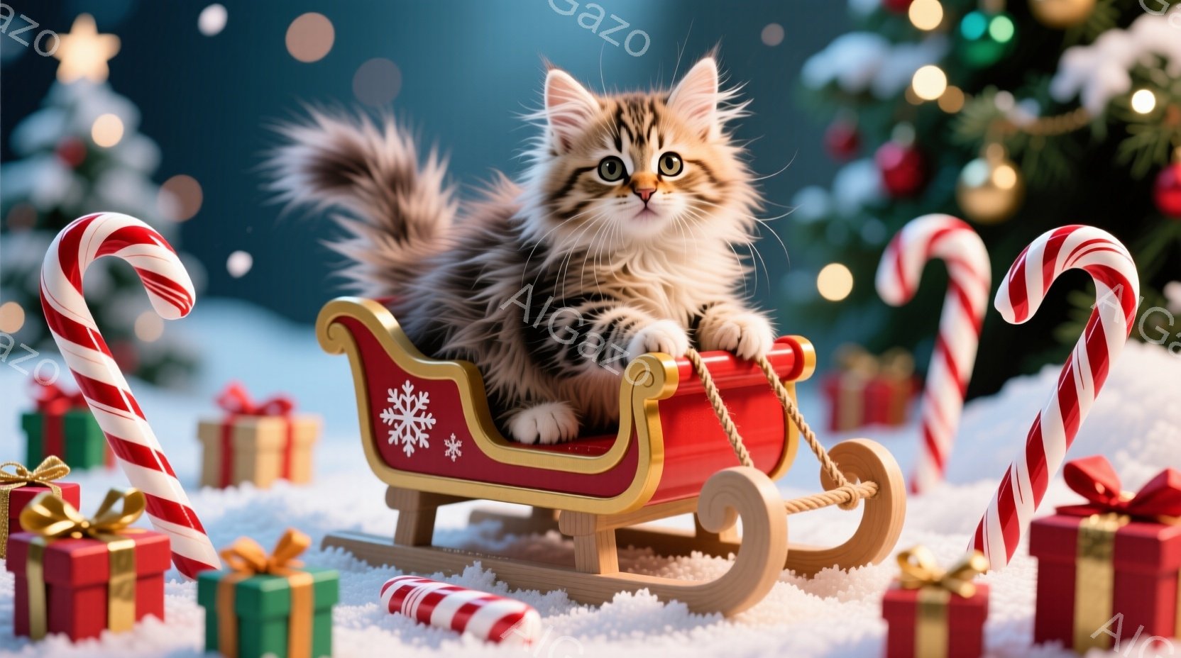 ふわふわの茶トラ猫が赤いそりに座り、前足をそりの縁につかまっています。背景には、プレゼントボックスやキャンディケーンが雪の上に置かれ、ぼやけたクリスマスツリーが暖かく輝いています。全体的に、可愛らしく、温かいクリスマスの雰囲気が漂っています。