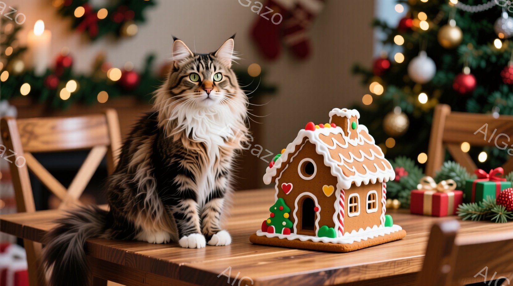 この無料AI生成画像「長毛の猫が雪で覆われたベンチに横たわっており、赤いリボンと鈴のネックレスをつけている。背景にはぼやけたクリスマスマーケットのような賑わいがあり、温かい光が輝いている。雪が舞い散る冬の夜の、暖かく、お祝いムードに満ちた光景である。」は、2025年10月25日に作成されました。 サイズは 1664×928px の高解像度で、商用利用も可能なフリー素材として提供しています。