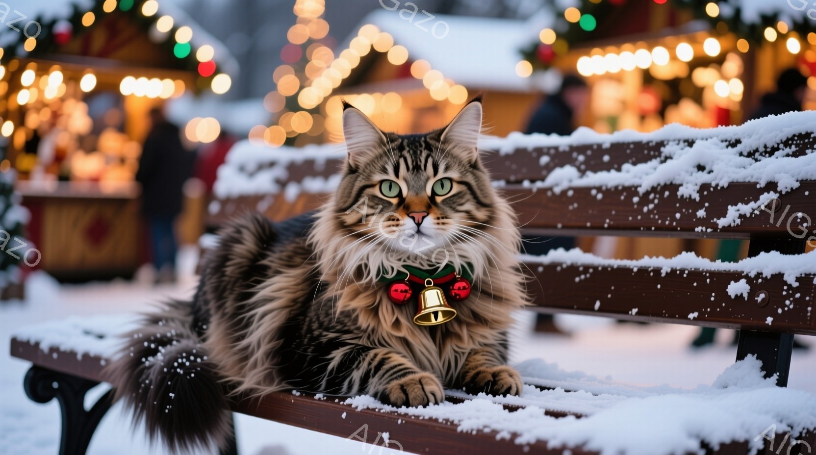 長毛の猫が雪で覆われたベンチに横たわっており、赤いリボンと鈴のネックレスをつけている。背景にはぼやけたクリスマスマーケットのような賑わいがあり、温かい光が輝いている。雪が舞い散る冬の夜の、暖かく、お祝いムードに満ちた光景である。