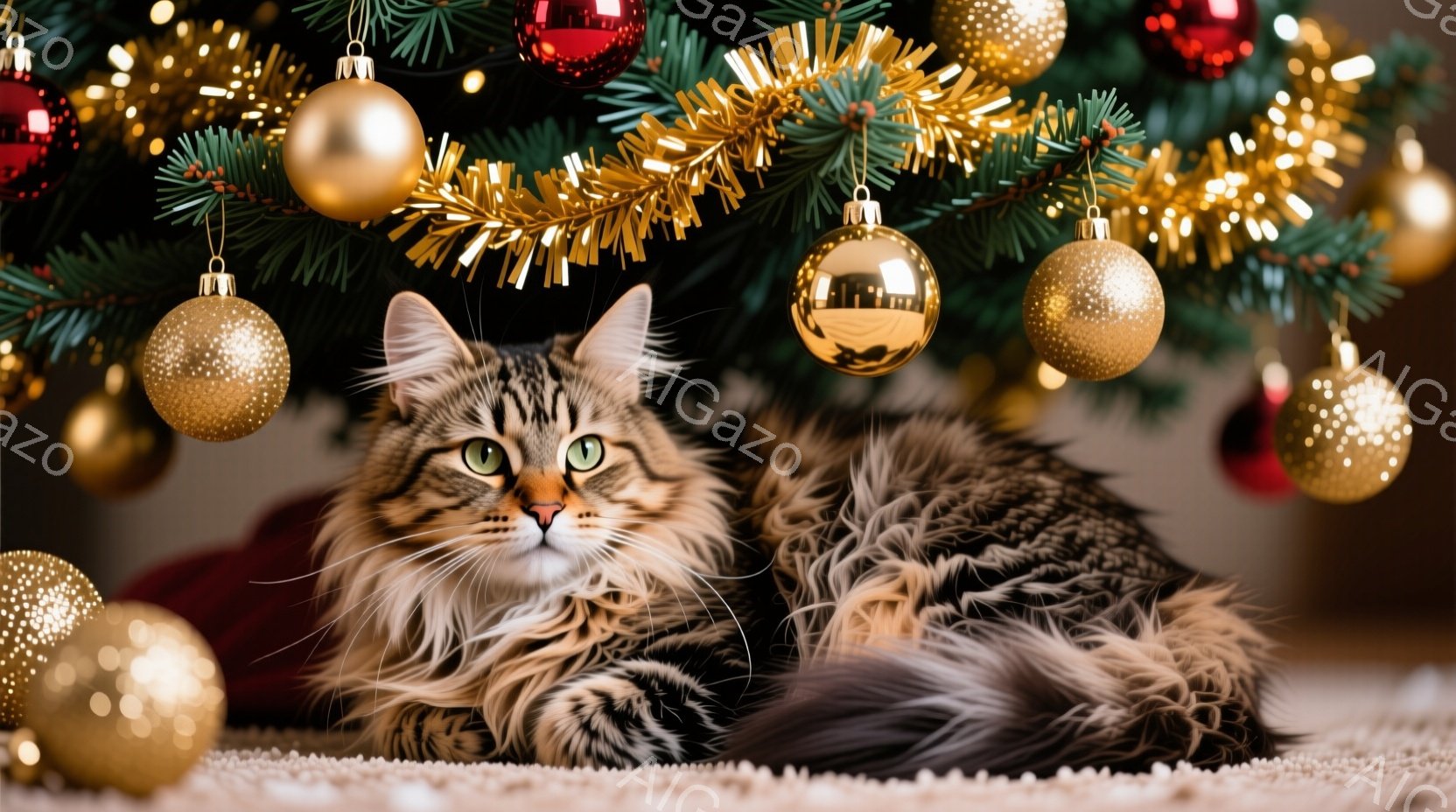 黒と茶色の縞模様の大きな猫が、白い毛並みのラグの上に丸まって座っています。猫は緑色の目をしており、穏やかでリラックスした表情を浮かべています。背景には、金色のオーナメントで飾られたクリスマスツリーがあり、暖かく、お祝いムードの雰囲気を作り出しています。