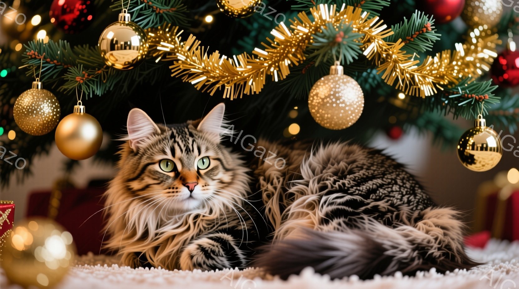 長毛の縞模様の猫が、クリスマスツリーの下に横たわっています。緑色の瞳が印象的で、リラックスした表情でカメラを見つめています。背景には、金色のモールと様々な色のオーナメントで飾られたクリスマスツリーがあり、暖かく華やかな雰囲気を醸し出しています。