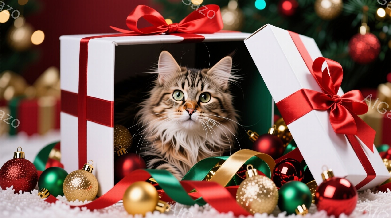 この無料AI生成画像「長毛の縞模様の猫が、クリスマスツリーの下に横たわっています。緑色の瞳が印象的で、リラックスした表情でカメラを見つめています。背景には、金色のモールと様々な色のオーナメントで飾られたクリスマスツリーがあり、暖かく華やかな雰囲気を醸し出しています。」は、2025年10月25日に作成されました。 サイズは 1664×928px の高解像度で、商用利用も可能なフリー素材として提供しています。