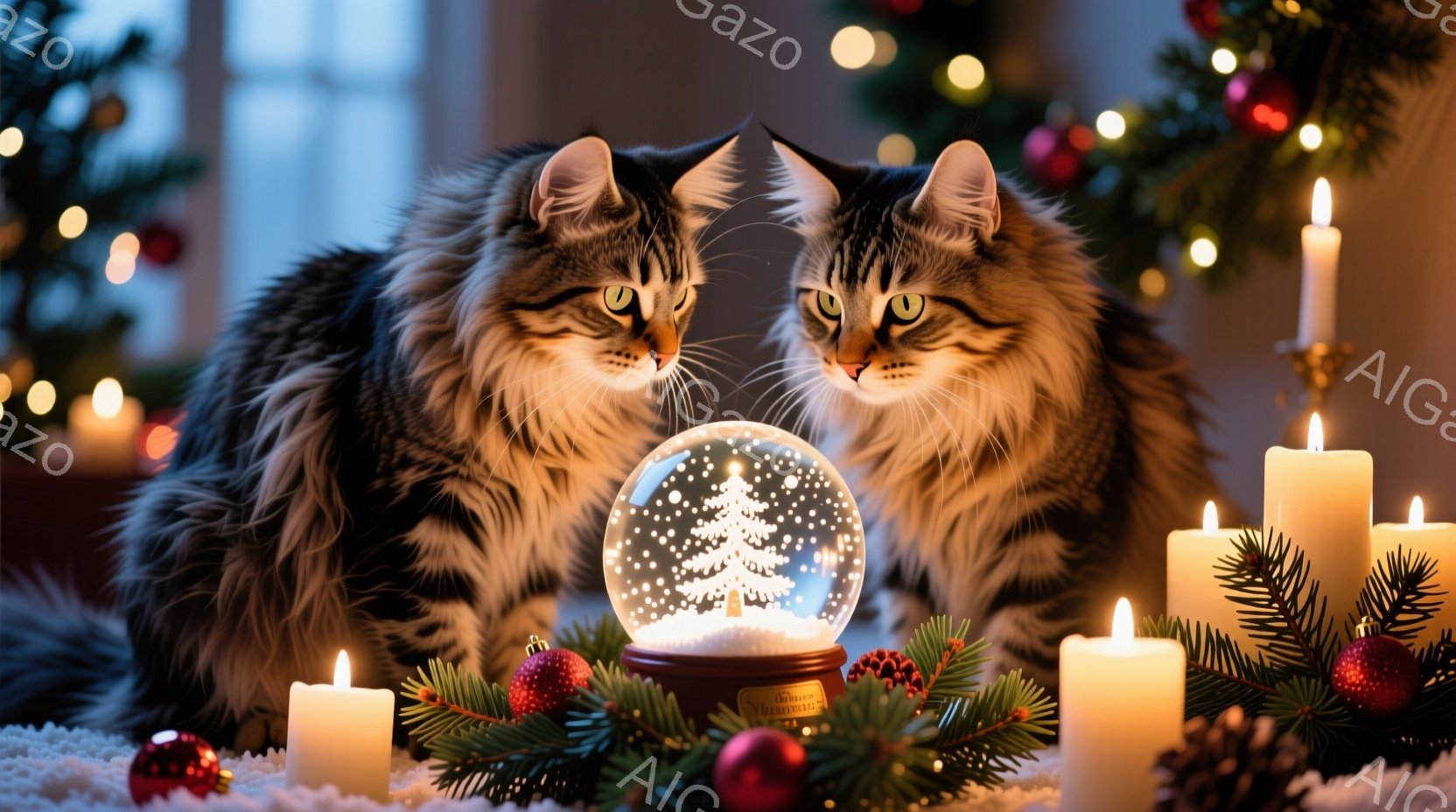 ふわふわの毛並みを持つ二匹の猫が、雪の結晶が舞うクリスマスのオーナメントであるスノーグローブをじっと見つめています。周囲には、暖かく光るキャンドルや、クリスマスツリーの緑、松ぼっくりが配置され、冬の暖炉のような雰囲気を醸し出しています。背景はぼかされており、光の玉が散りばめられ、幻想的で温かいクリスマスの光景を表現しています。