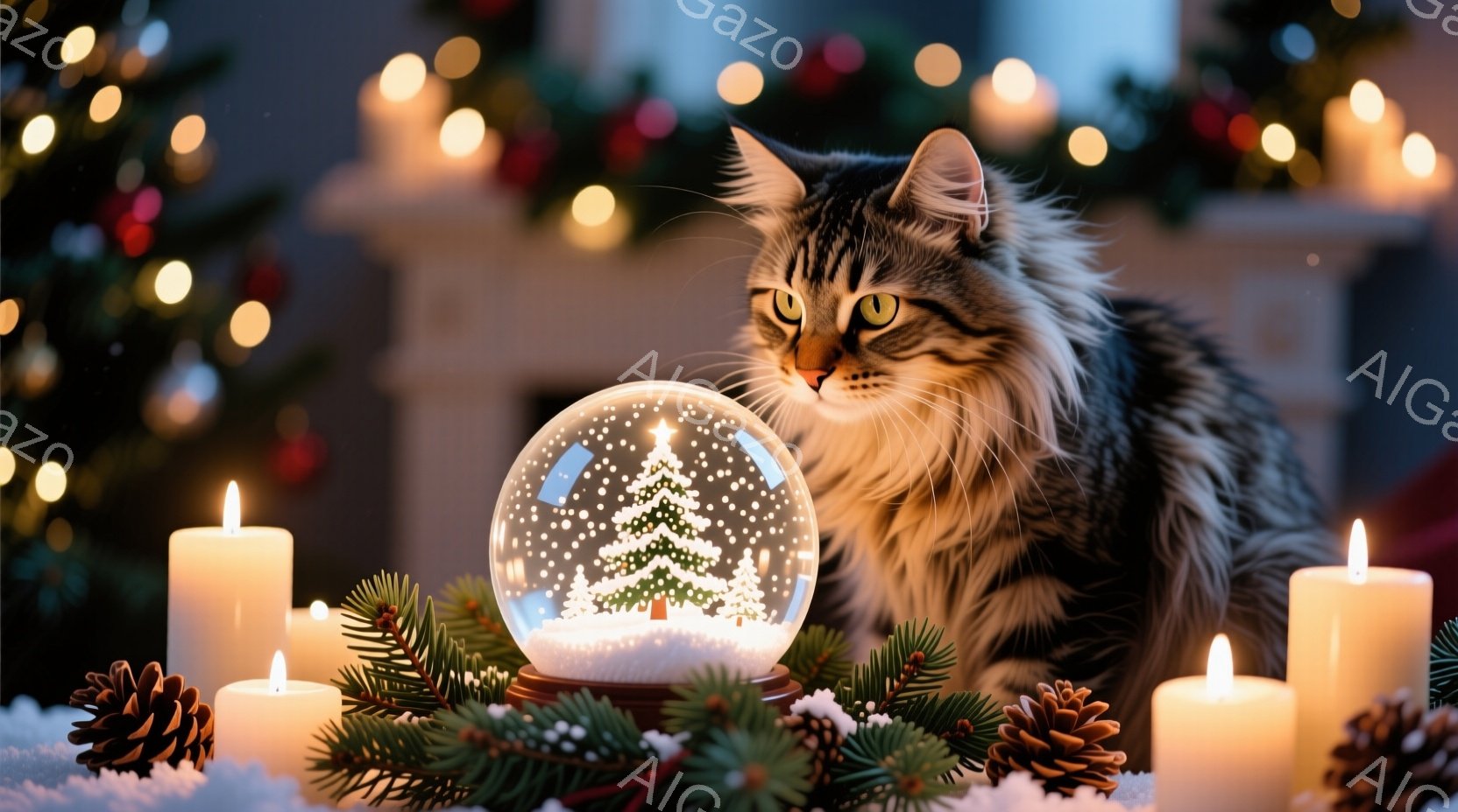 2匹のふわふわした猫が、雪の結晶が舞うスノーグローブをじっと見つめています。猫たちは毛並みが美しく、緑色の瞳が印象的で、リラックスした表情をしています。背景には、クリスマスツリーのぼんやりとした光と、点在するキャンドルがあり、温かく幻想的な雰囲気を醸し出しています。