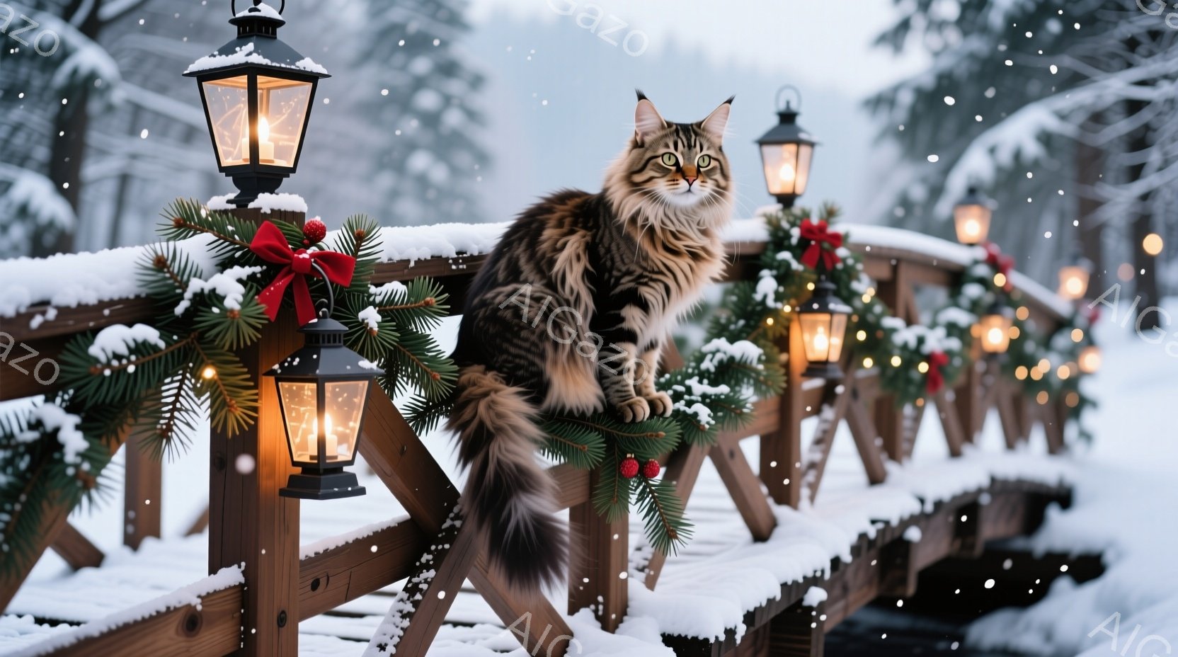 ふわふわの長毛の猫が、雪で覆われた木の橋の欄干に座ってこちらを見つめている。橋の欄干には、松のリースと点灯したランタンが飾られており、雪が静かに降り積もる冬の風景の中に暖かな光が灯っている。背景にはぼやけた木々が見え、穏やかで幻想的な雰囲気が漂っている。