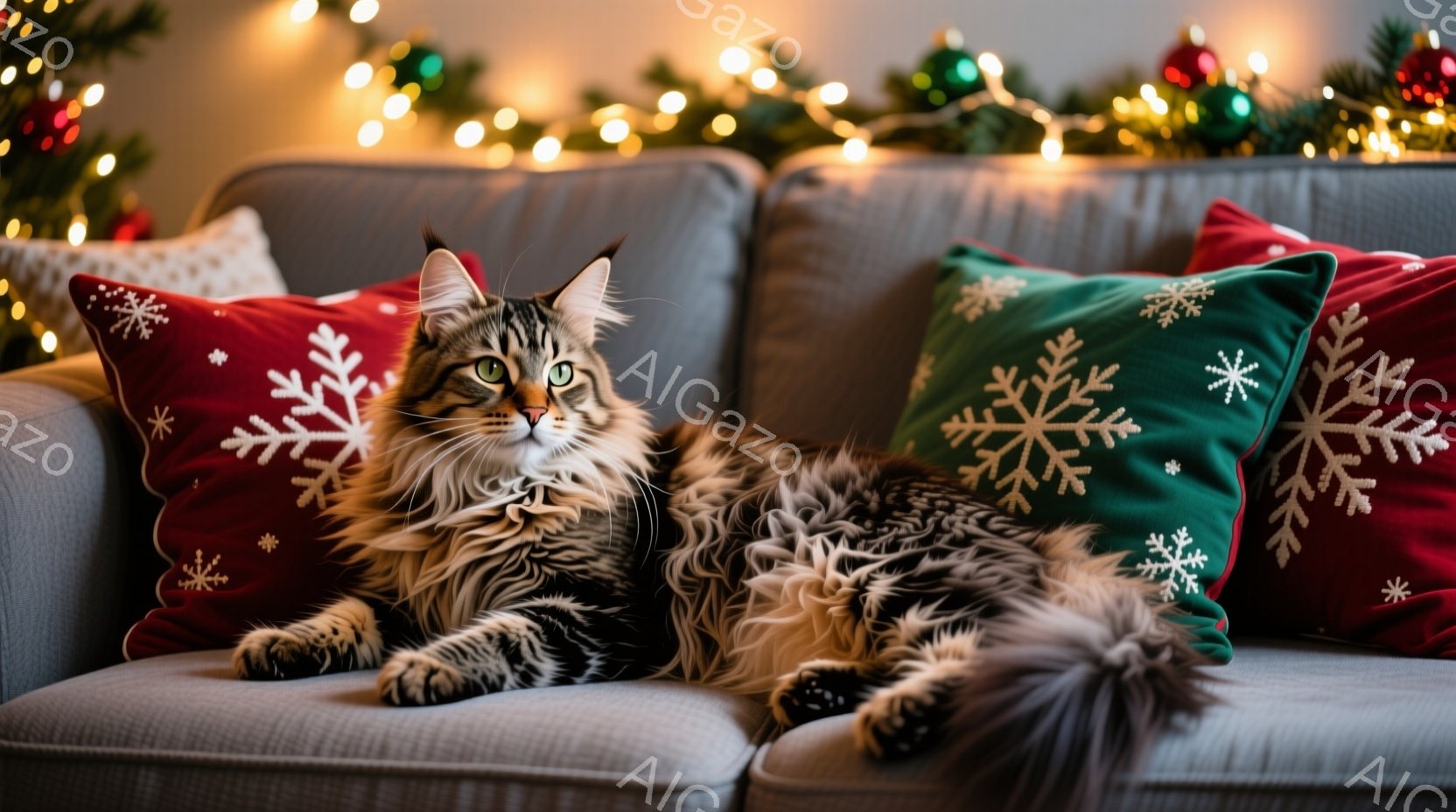 この無料AI生成画像「茶色の編みバスケットの中に、縞模様の猫が可愛らしく顔を覗かせています。バスケットの中には、赤い実と緑の葉で飾られたジンジャーブレッドマンと、赤と白のキャンディケーンが散りばめられています。背景はぼやけたクリスマスツリーの光で、温かく、お祝いの雰囲気です。」は、2025年10月25日に作成されました。 サイズは 1664×928px の高解像度で、商用利用も可能なフリー素材として提供しています。