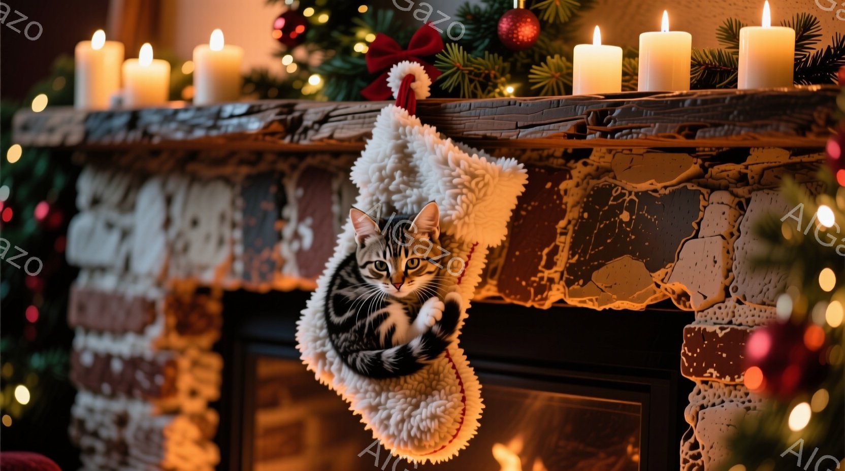 暖炉の上に、クリスマスの靴下がぶら下がっており、その中には縞模様の可愛らしい子猫が丸まって入っています。子猫は好奇心とわずかな警戒心のある表情でカメラを見ており、暖炉の周りには点灯したキャンドルやクリスマスの飾り付けが温かい光を放っています。全体的に、クリスマスの温かく居心地の良い雰囲気が漂う、魅力的な光景です。