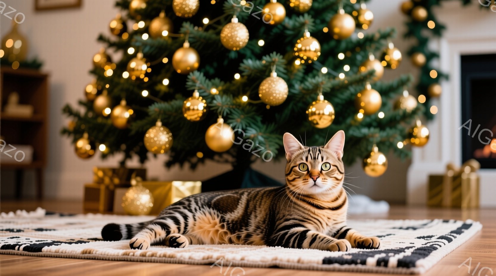 縞模様の猫が、クリーム色のラグの上に横たわっています。背景には、金色のオーナメントで飾られたクリスマスツリーと、包装されたプレゼントが見え、暖かくお祝いの雰囲気を醸し出しています。猫はリラックスした表情で、落ち着いた空間に穏やかな印象を与えています。