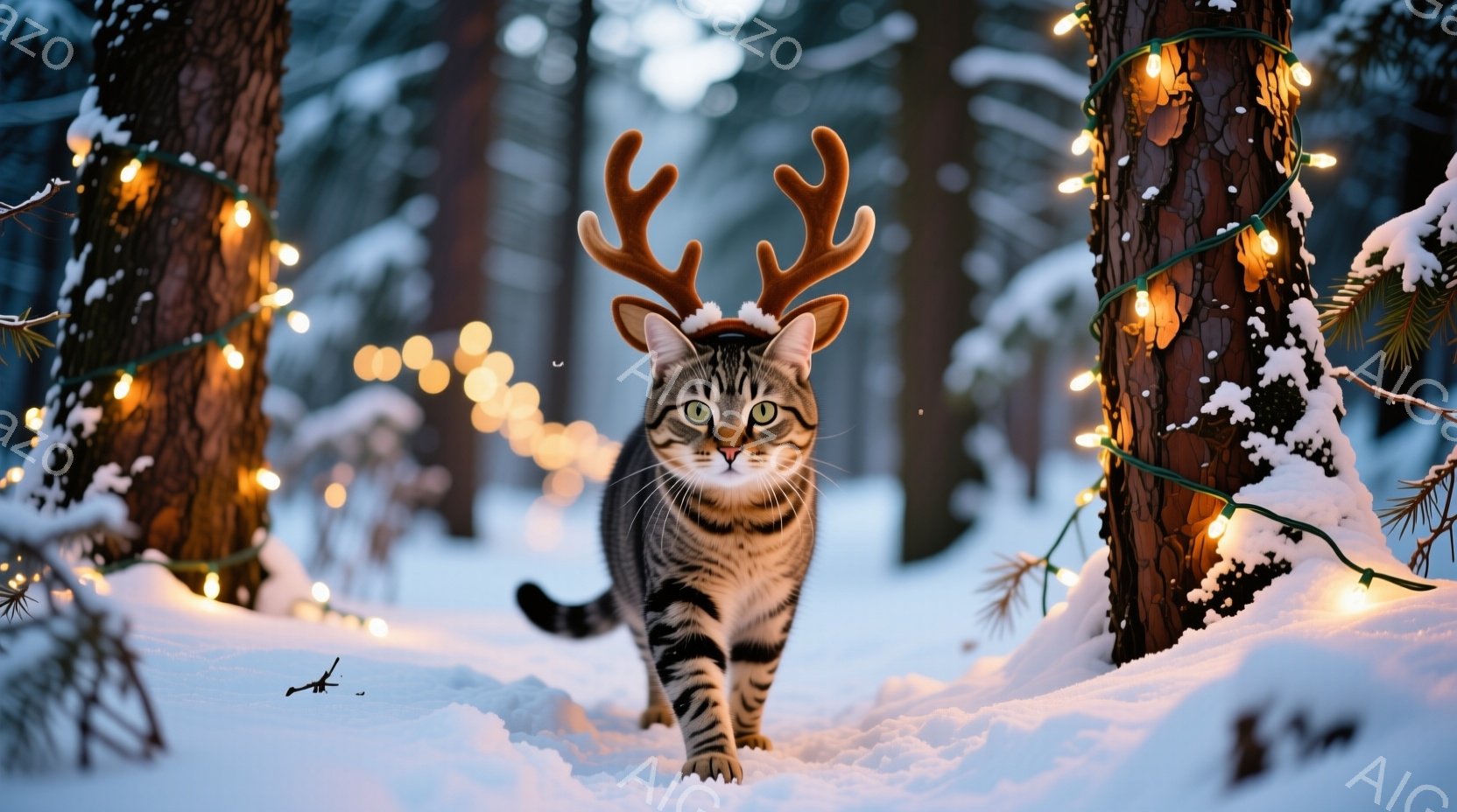 縞模様の猫が、頭にトナカイの角をつけて雪の中をまっすぐ歩いてくる。背景には雪に覆われた木々と、暖かみのある電飾が輝き、冬の森の静けさとほのぼのとした雰囲気が漂っている。猫は前を見据え、少し真剣な表情で、まるでクリスマスの使者であるかのように見える。