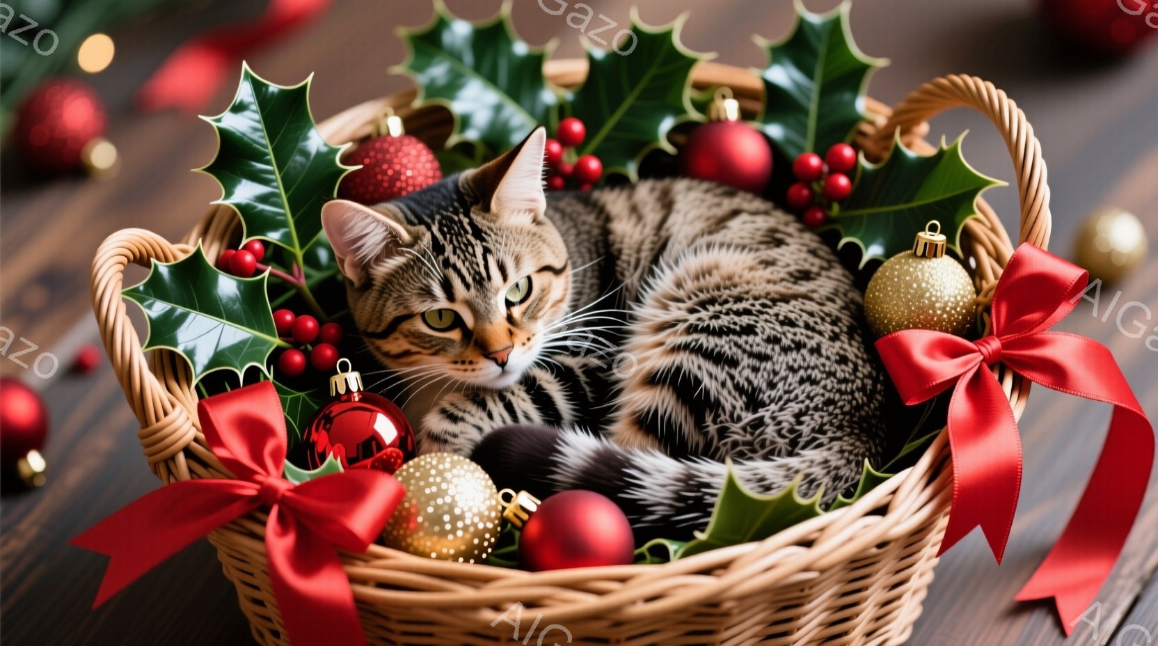 茶色と黒の縞模様の猫が、赤いリボンと輝くクリスマスオーナメントで飾られたバスケットの中に丸まって眠っています。背景には緑の葉と赤い実、そしてぼやけたクリスマスの装飾がみえ、温かく穏やかな雰囲気を醸し出しています。猫の穏やかな表情とクリスマスデコレーションが、冬の居心地の良いひとときを表現しています。