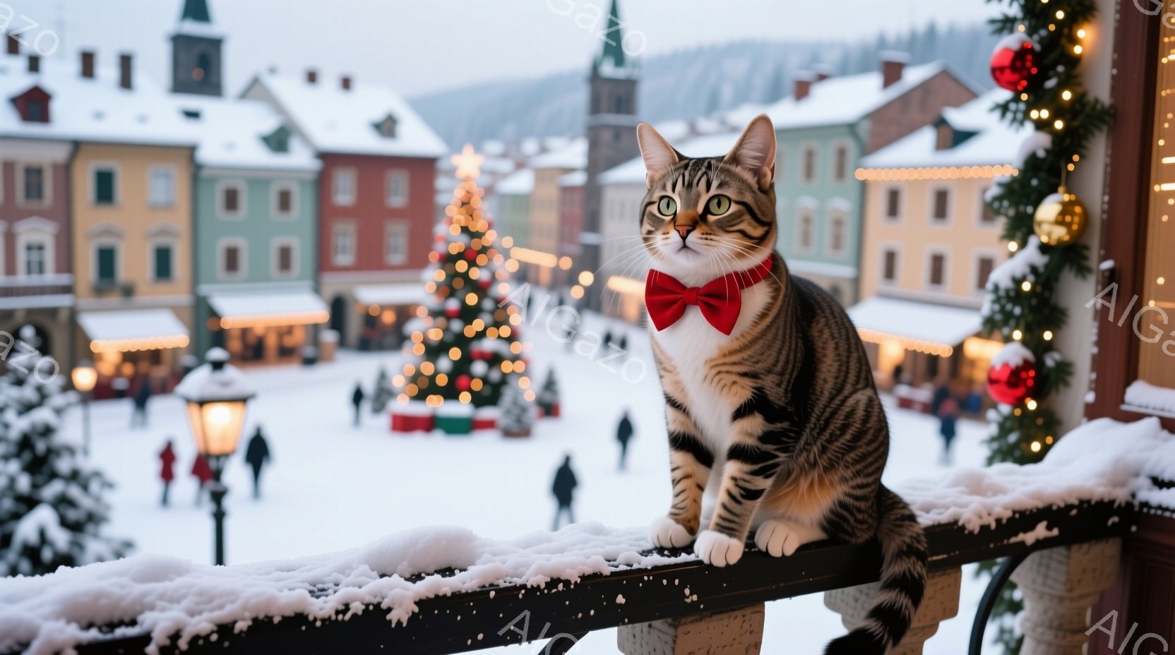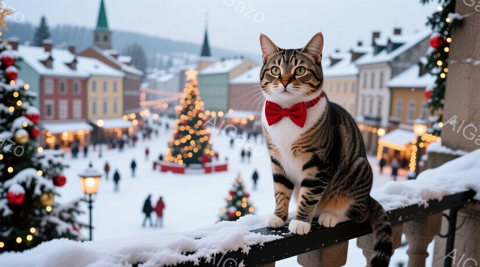 明るい縞模様の猫が、赤い蝶ネクタイを締め、雪で覆われた手すりに座って正面を見つめている。背景には、クリスマスツリーや人々で賑わう雪景色が広がり、中世ヨーロッパのような建物が立ち並んでいる。全体的に、冬の暖かくお祭り気分な雰囲気の画像である。