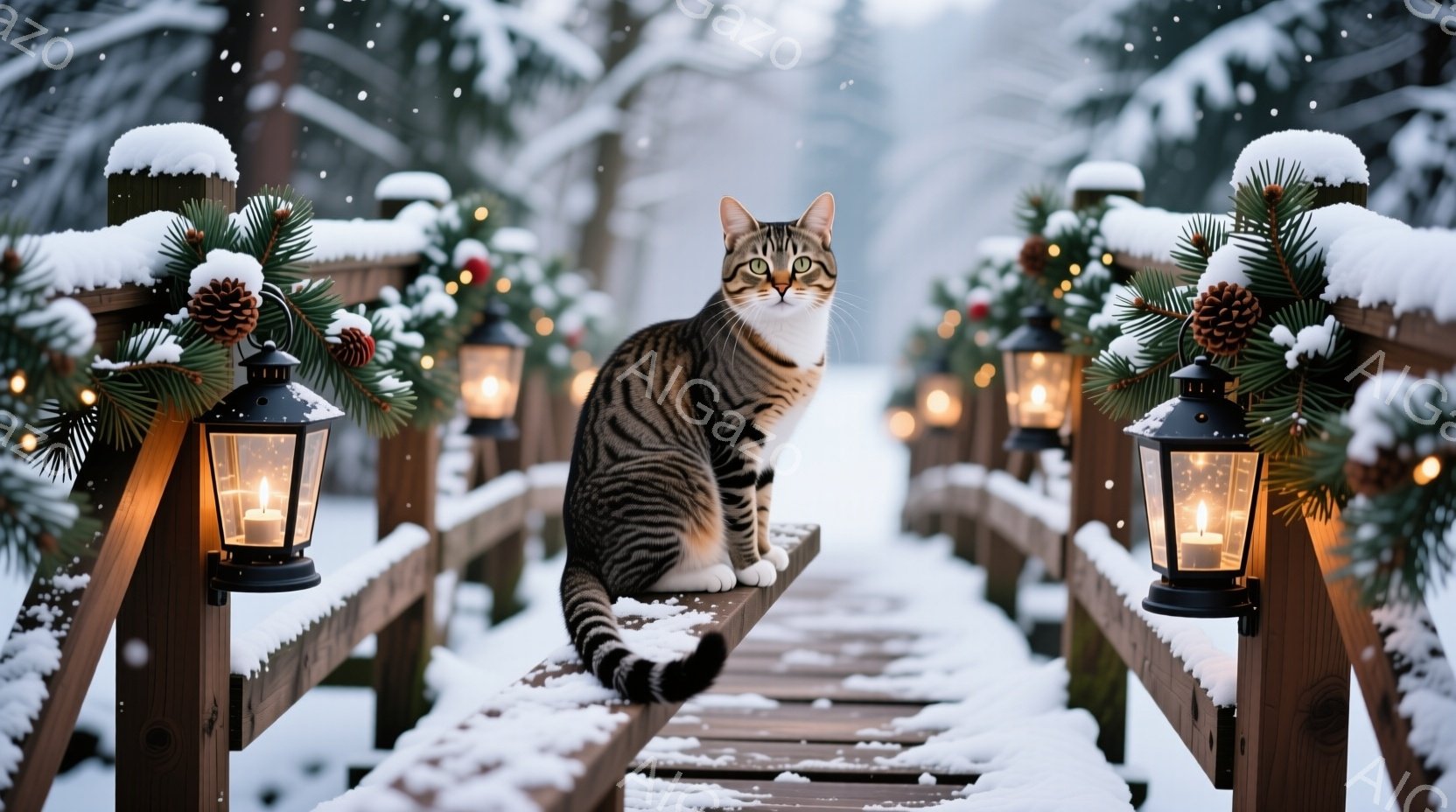 雪が降る中で、縞模様の猫が木の柵の上で優雅に座っています。背景には、クリスマスツリーの飾りと点灯したランタンが並び、冬の暖かく幻想的な雰囲気を醸し出しています。雪景色と暖かい光のコントラストが、穏やかで平和な印象を与えます。