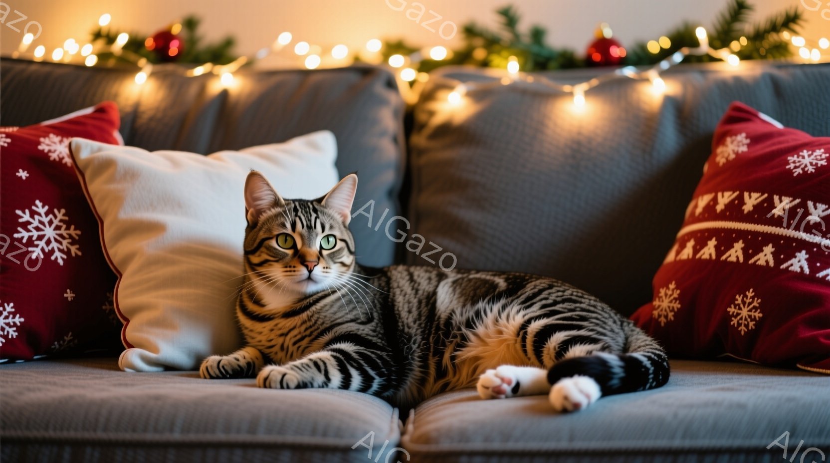 この無料AI生成画像「雪が降る中で、縞模様の猫が木の柵の上で優雅に座っています。背景には、クリスマスツリーの飾りと点灯したランタンが並び、冬の暖かく幻想的な雰囲気を醸し出しています。雪景色と暖かい光のコントラストが、穏やかで平和な印象を与えます。」は、2025年10月25日に作成されました。 サイズは 1664×928px の高解像度で、商用利用も可能なフリー素材として提供しています。