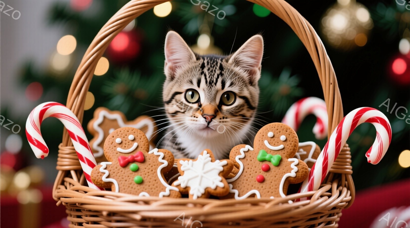 籠の中に、白い胸元と縞模様の毛並みを持つ子猫が可愛らしく顔を出しています。周りには、赤いリボンと緑の葉で飾られたジンジャーブレッドマンと、赤と白の縞模様のキャンディケインが散りばめられています。背景には、ぼやけたクリスマスツリーと光のぼかしがあり、温かく、お祝いの雰囲気を醸し出しています。