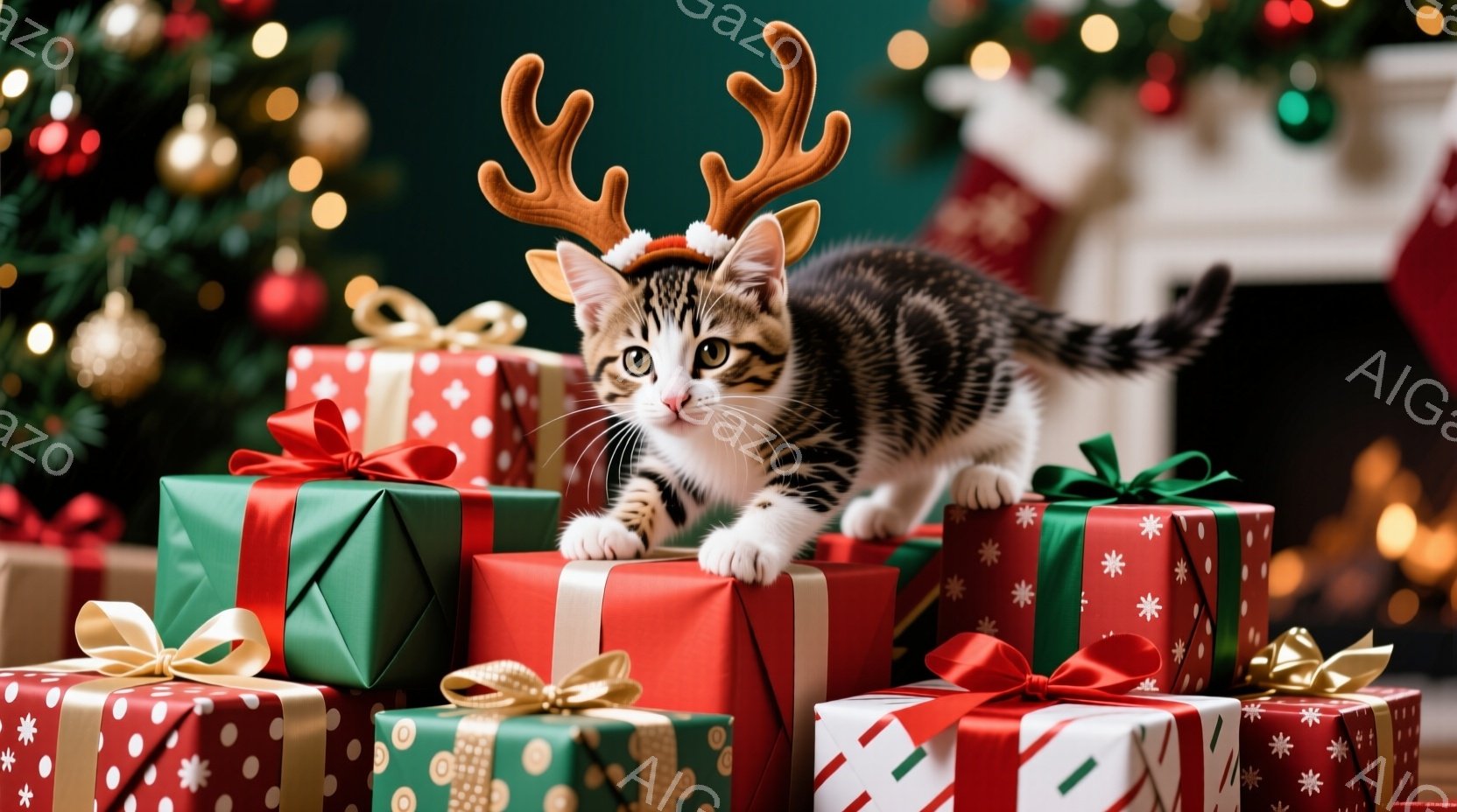 茶色の縞模様の小さな子猫が、クリスマスプレゼントの山の上でポーズをとっています。頭には角の飾りをつけており、好奇心と遊び心に満ちた表情をしています。背景には、緑色のクリスマスツリーとキラキラと光るホリデーライトがあり、暖かくお祝いの雰囲気です。