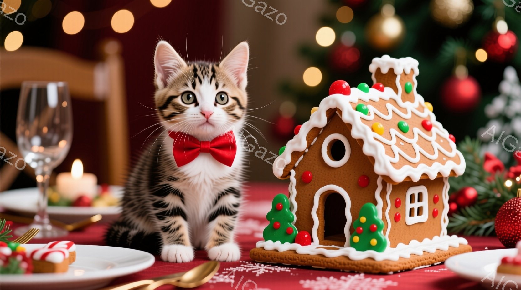 縞模様の小さな子猫が赤い蝶ネクタイをつけ、クリスマスのジンジャーブレッドハウスの隣に座っています。背景には、ぼやけたクリスマスツリーと、ぼんやりとした暖色の光が散りばめられています。全体的に、お祝いの雰囲気を醸し出しており、可愛らしさと温かさを感じさせる画像です。