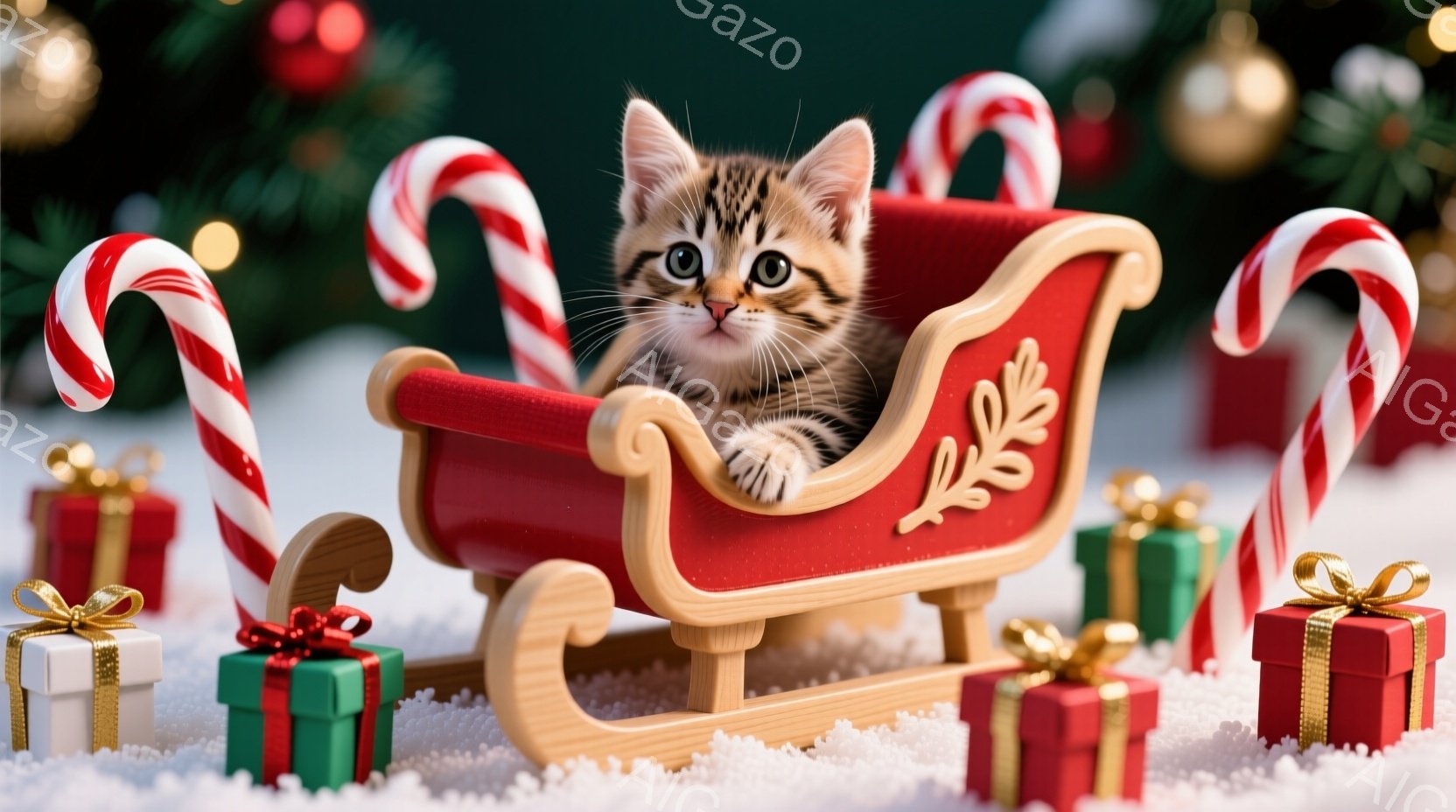 この無料AI生成画像「縞模様の小さな子猫が赤い蝶ネクタイをつけ、クリスマスのジンジャーブレッドハウスの隣に座っています。背景には、ぼやけたクリスマスツリーと、ぼんやりとした暖色の光が散りばめられています。全体的に、お祝いの雰囲気を醸し出しており、可愛らしさと温かさを感じさせる画像です。」は、2025年10月25日に作成されました。 サイズは 1664×928px の高解像度で、商用利用も可能なフリー素材として提供しています。