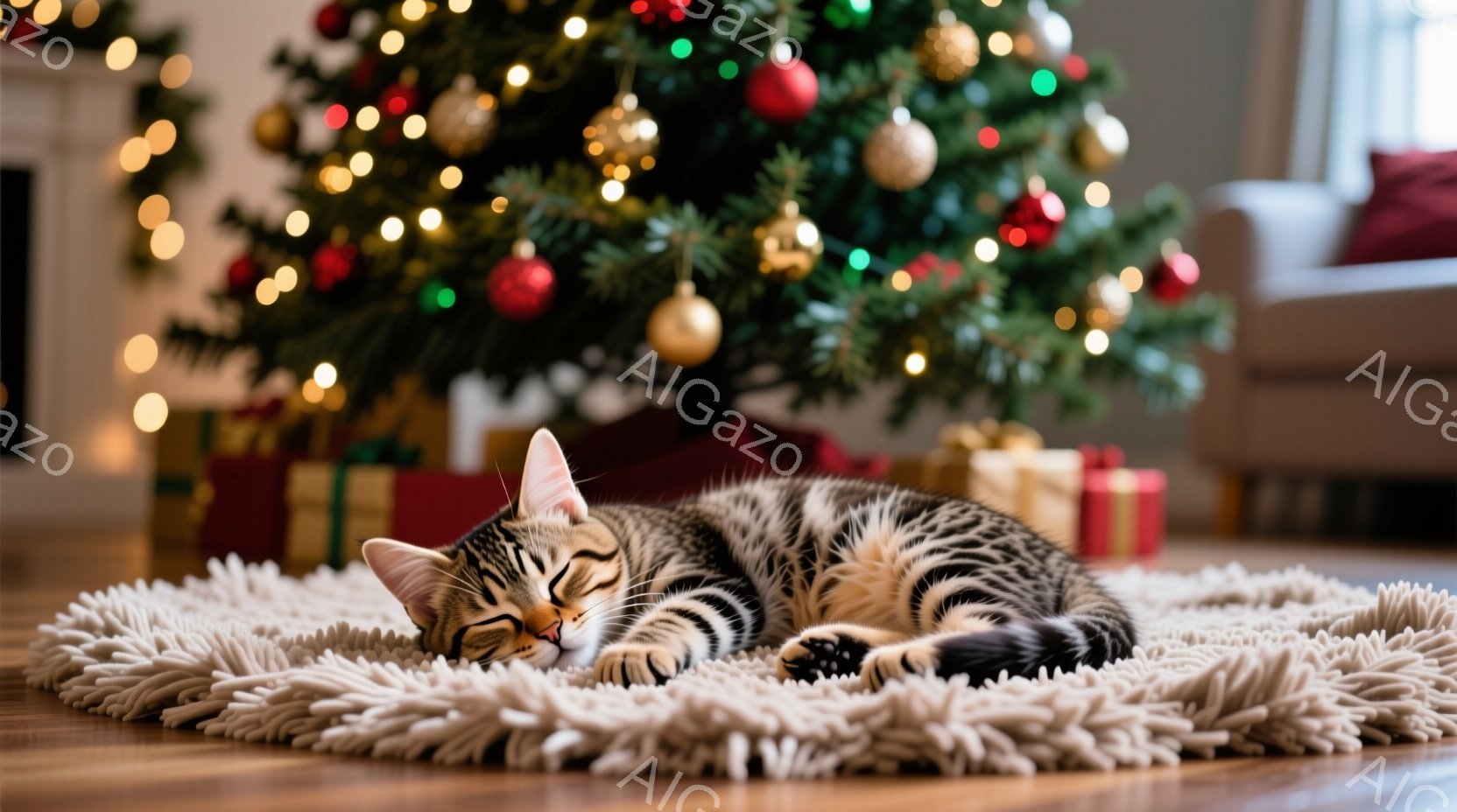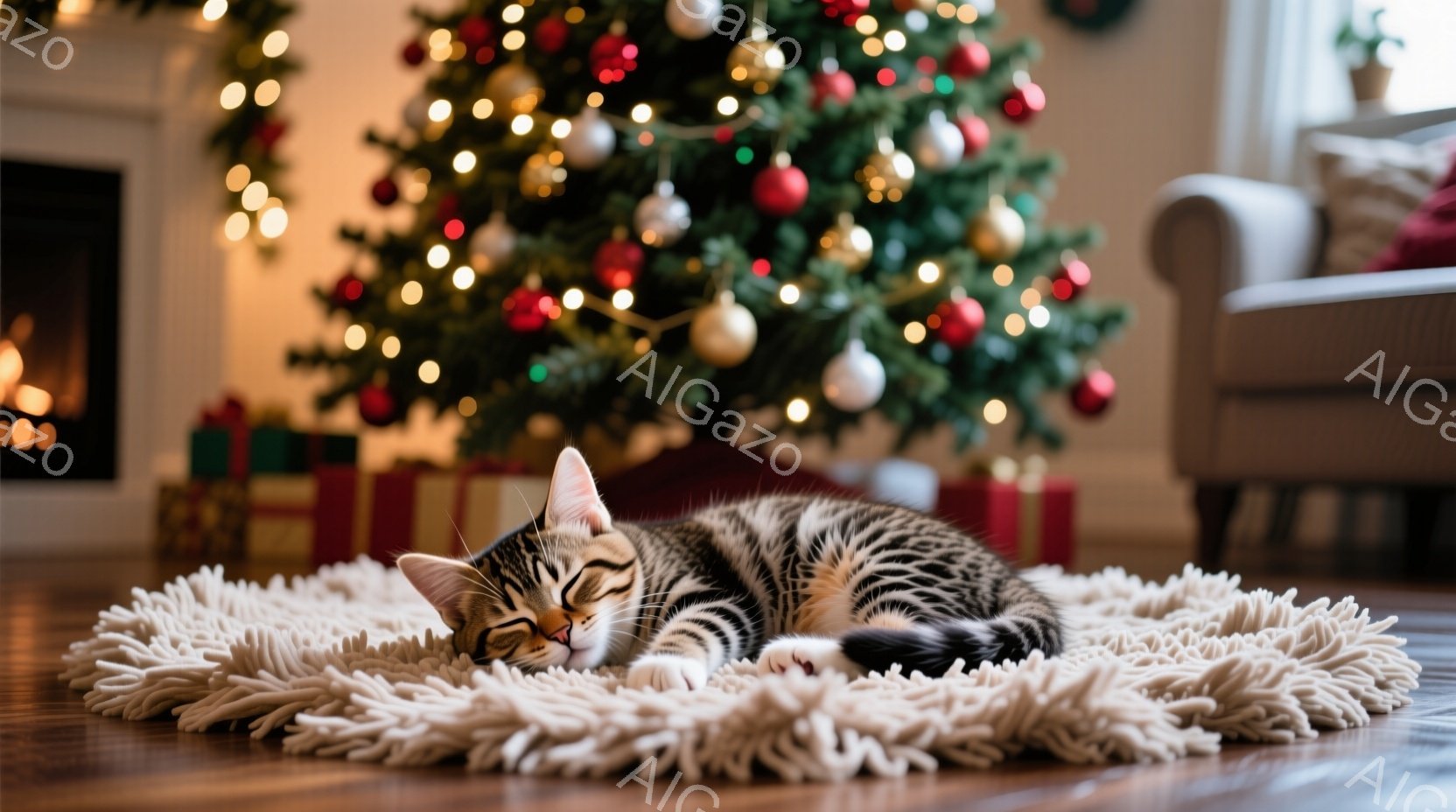 縞模様の小さな子猫が、ふわふわの白いラグの上で丸まって眠っています。背景には、オーナメントとプレゼントで飾られたクリスマスツリーがあり、温かく穏やかな雰囲気を醸し出しています。木製の床と明るい室内照明が、ホリデーシーズンの居心地の良い光景を強調しています。
