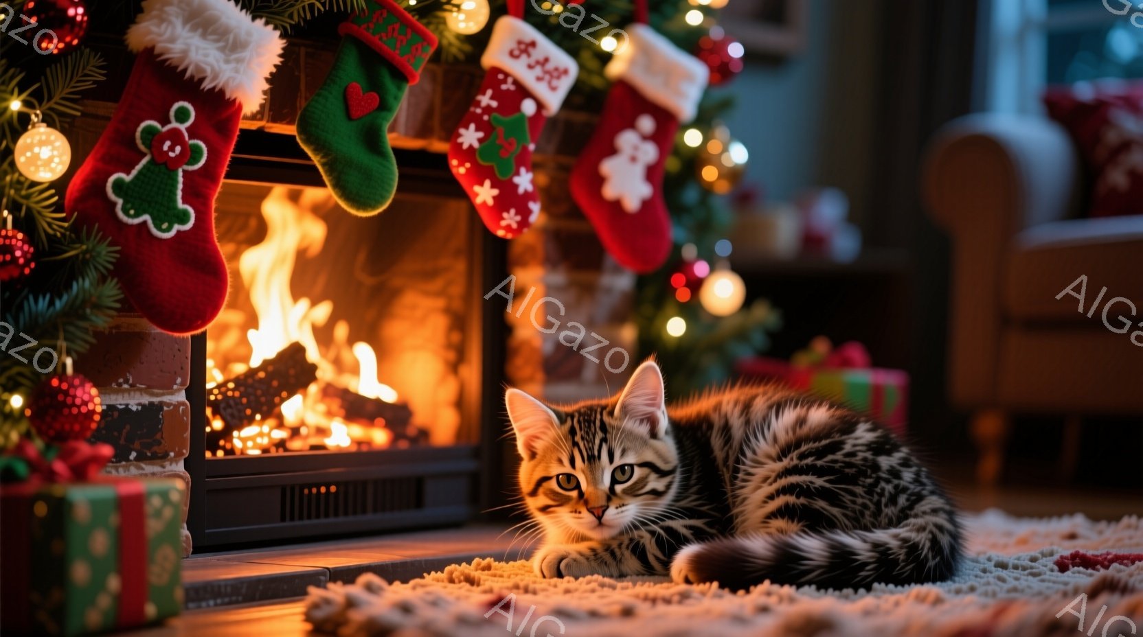 暖炉のそばで縞模様の猫がリラックスして横たわっています。背景には、クリスマスツリー、プレゼント、赤いクリスマスストッキングが飾られており、暖かく居心地の良い雰囲気が漂っています。猫の目はカメラをじっと見つめており、その表情は穏やかで心地よさそうです。