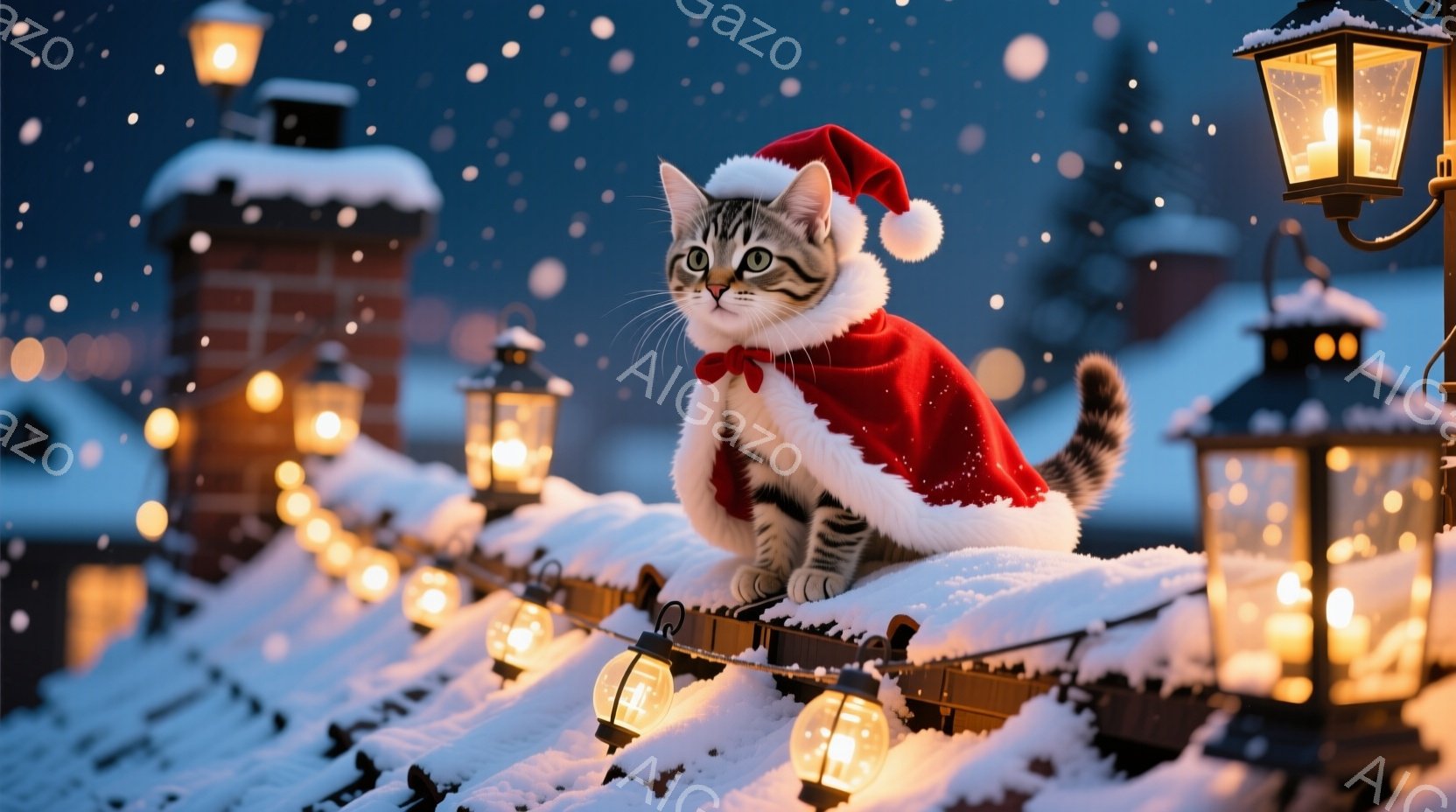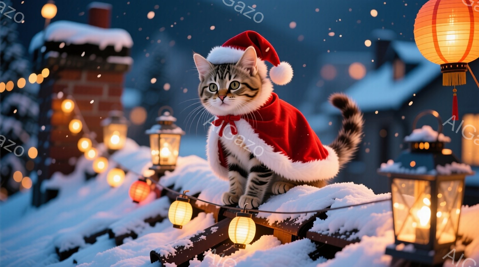 白と灰色の縞模様の猫が、赤いサンタの帽子とマントを身につけて雪の上に座っています。周りには点灯したランタンが並び、雪が降り積もる屋根と遠くに見える建物がぼんやりと見えます。全体的に、暖かく、お祝いの雰囲気で、冬の夜の穏やかな光景です。