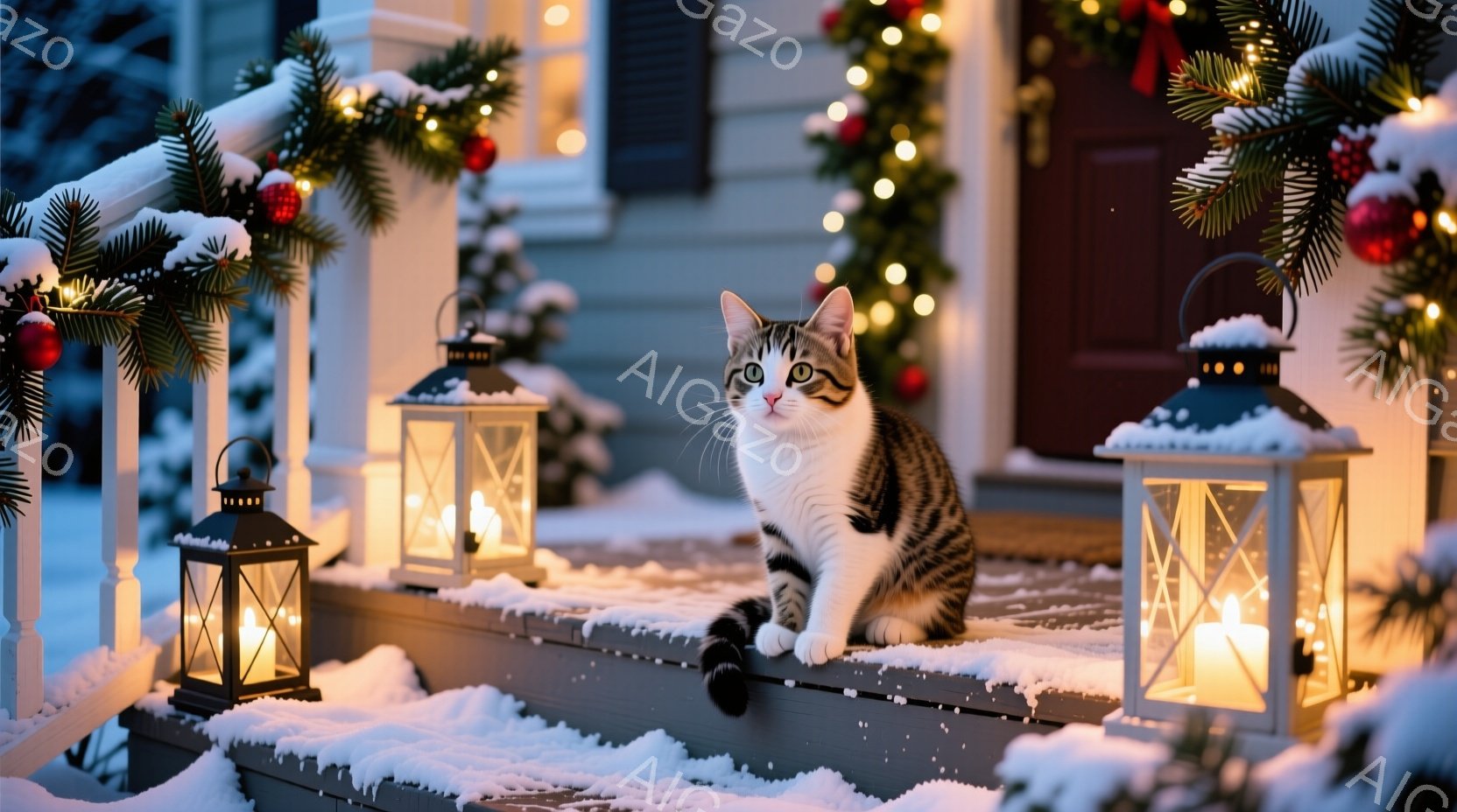 白と茶色の縞模様の猫が、雪で覆われた家のポーチの階段に座っています。背景にはクリスマス装飾が施された玄関があり、光るランタンが雪の上に並べられています。全体的に暖かく、お祝いの雰囲気が漂い、冬の穏やかな光景が描かれています。